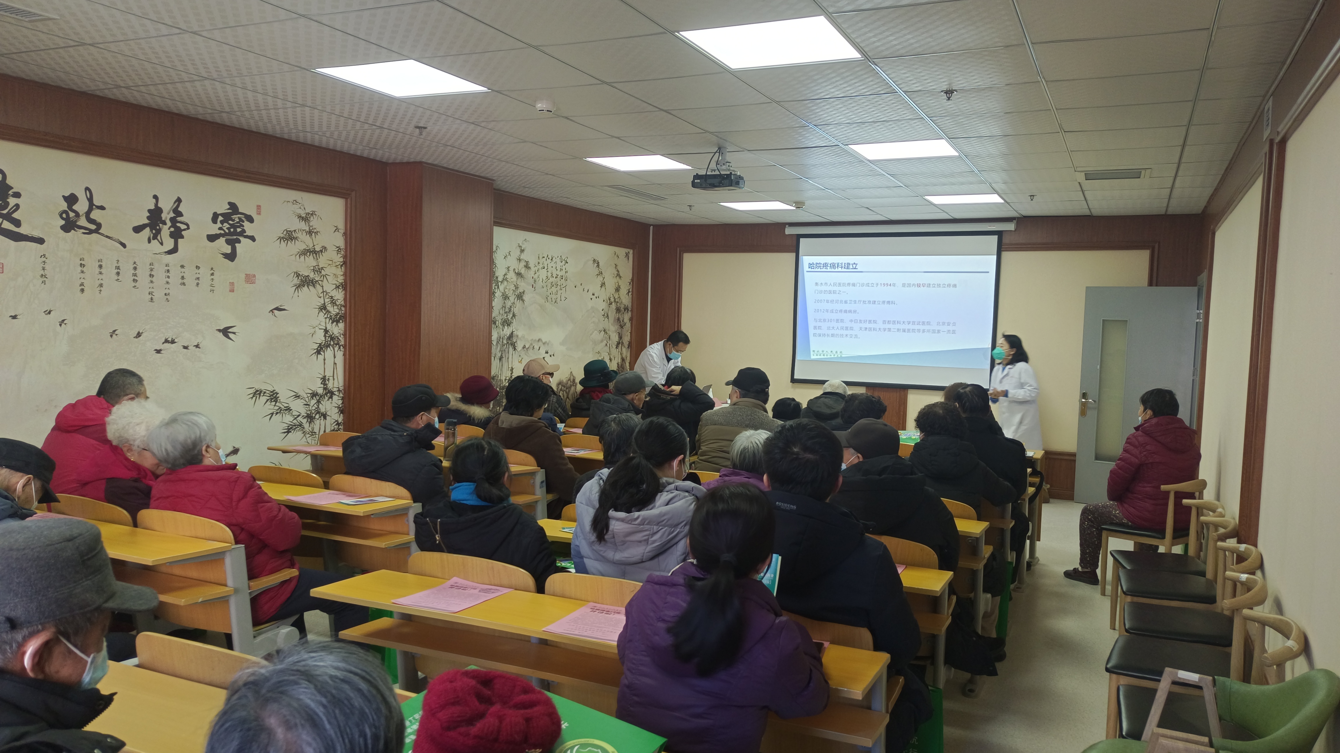 此次活動共40余人參加。活動現(xiàn)場,哈院預防保健科主任王艷靜首先向大家介紹了綜合門診的主要功能,希望大家提高健康意識,關注了解更多健康知識。哈院疼痛科副主任高謙通過圖文并茂的PPT課件形式,以通俗易懂、風趣幽默的語言,從常見疼痛病、老年疼痛特點、特色治療方法到真實案例分享,深入淺出地為居民詳細講解了關于疼痛的相關知識。現(xiàn)場居民認真聆聽、仔細記錄,積極互動、氣氛熱烈。