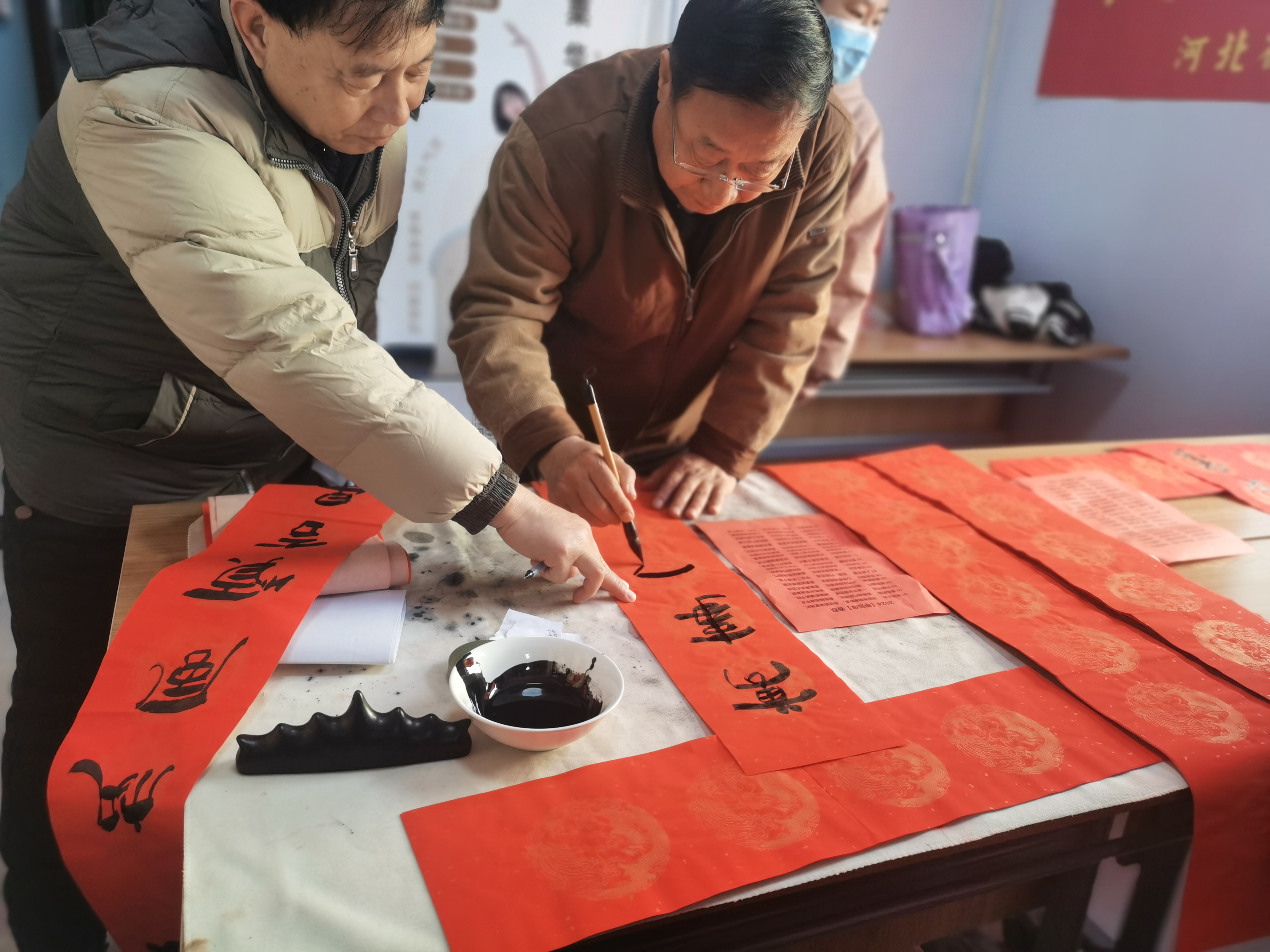 活動邀請了衡水毛體書法家協會的陳九如老師和王乃浩老師為社區居民免費寫春聯。“老師請幫我寫一張‘瑞氣滿門吉祥宅,春風及第如意家’,橫批‘福禧臨門’?!薄袄蠋熚蚁胍粡垺P歉哒杖腋?,春光耀輝滿堂春’,橫批‘春意盎然?!薄蠹叶计炔患按貙⒆约盒膬x的對聯句子告訴兩位老師。紅紙鋪開,兩位老師手持毛筆蘸飽墨汁,認真地為居民書寫,一筆一劃間傾注了他們的感情和祝福。