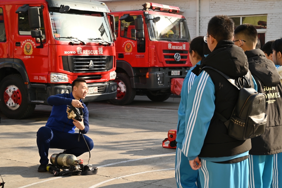 活動開始,消防戰(zhàn)士向同學(xué)們講解了常見消防器材的工作原理及其在滅火救災(zāi)、搶險救援中所發(fā)揮的作用,演示了消防戰(zhàn)斗服、空氣呼吸器等消防裝備器械的操作使用方法,隨后帶領(lǐng)大家參觀了新型消防應(yīng)急救援車并邀請同學(xué)們上車體驗(yàn)。