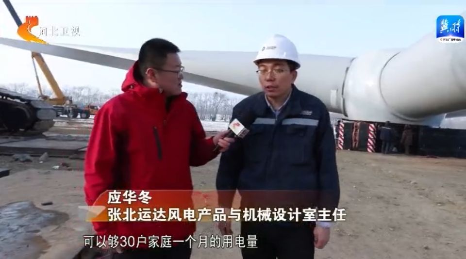 這臺(tái)具有全球陸地風(fēng)力發(fā)電'冠軍'稱號(hào)的風(fēng)力發(fā)電機(jī)組是張北運(yùn)達(dá)風(fēng)電剛剛生產(chǎn)下線的拳頭產(chǎn)品,它有14米長(zhǎng),將近5米寬,4.35米高,吊裝完成后,整個(gè)風(fēng)機(jī)高度達(dá)125米,單片葉片長(zhǎng)112米。