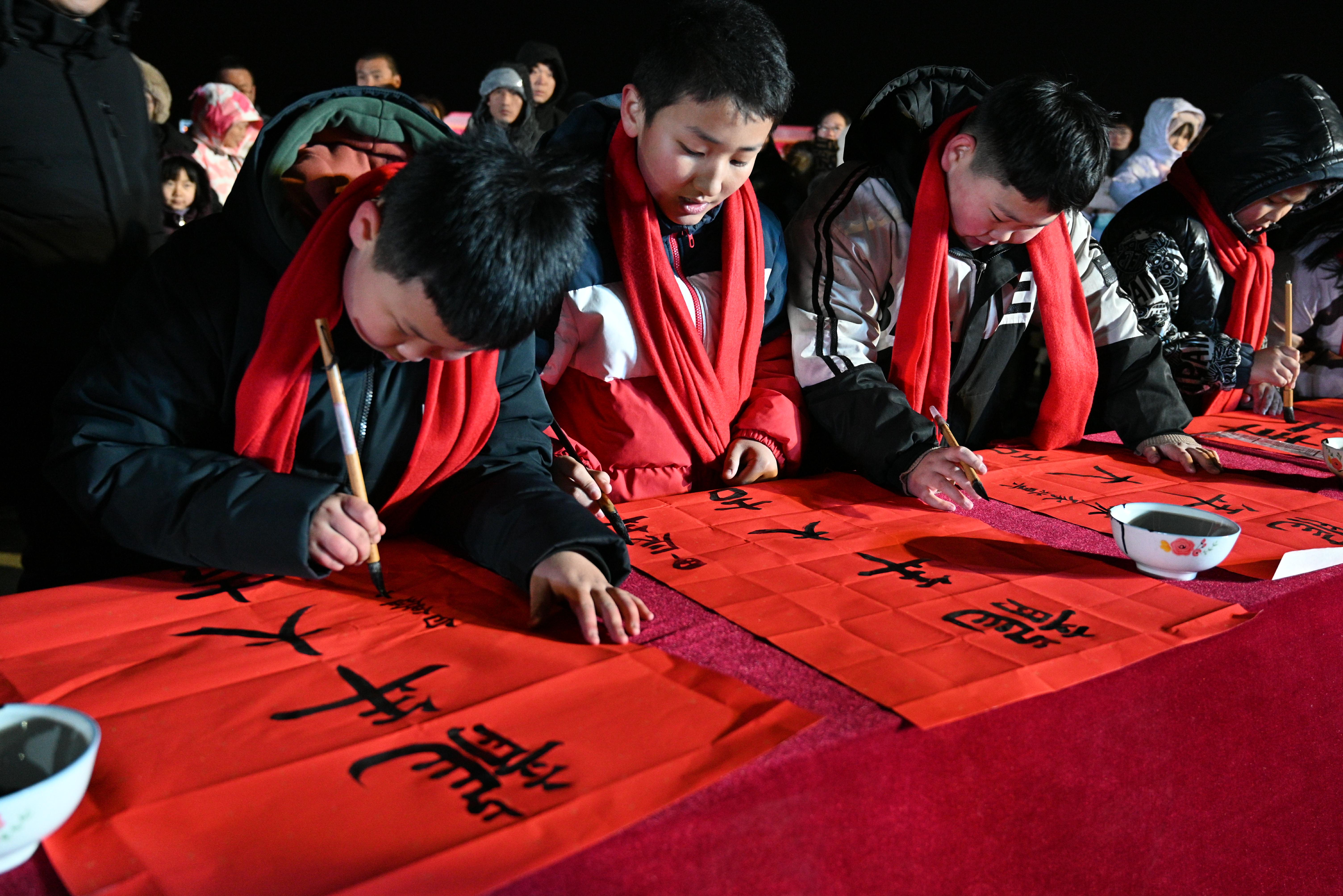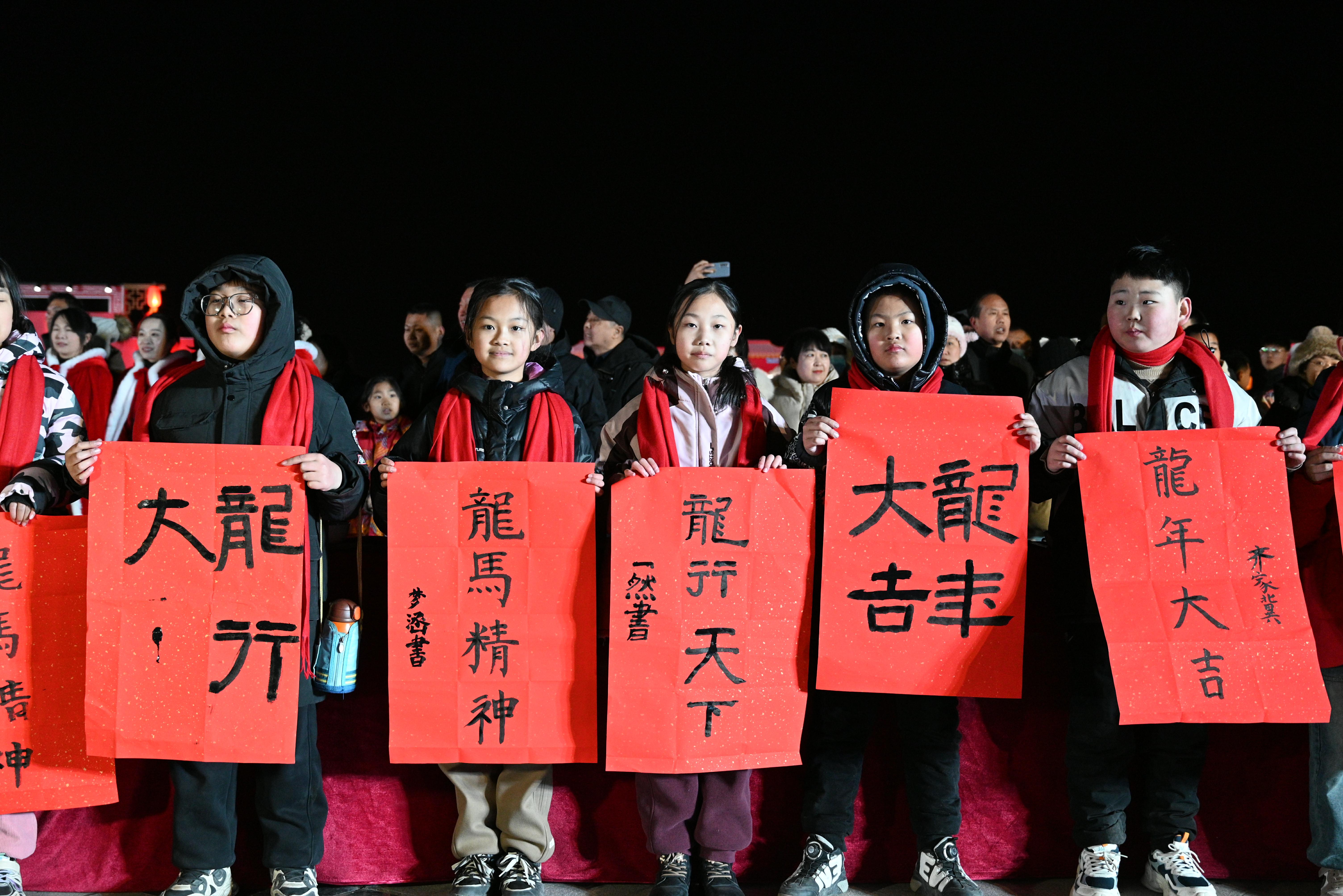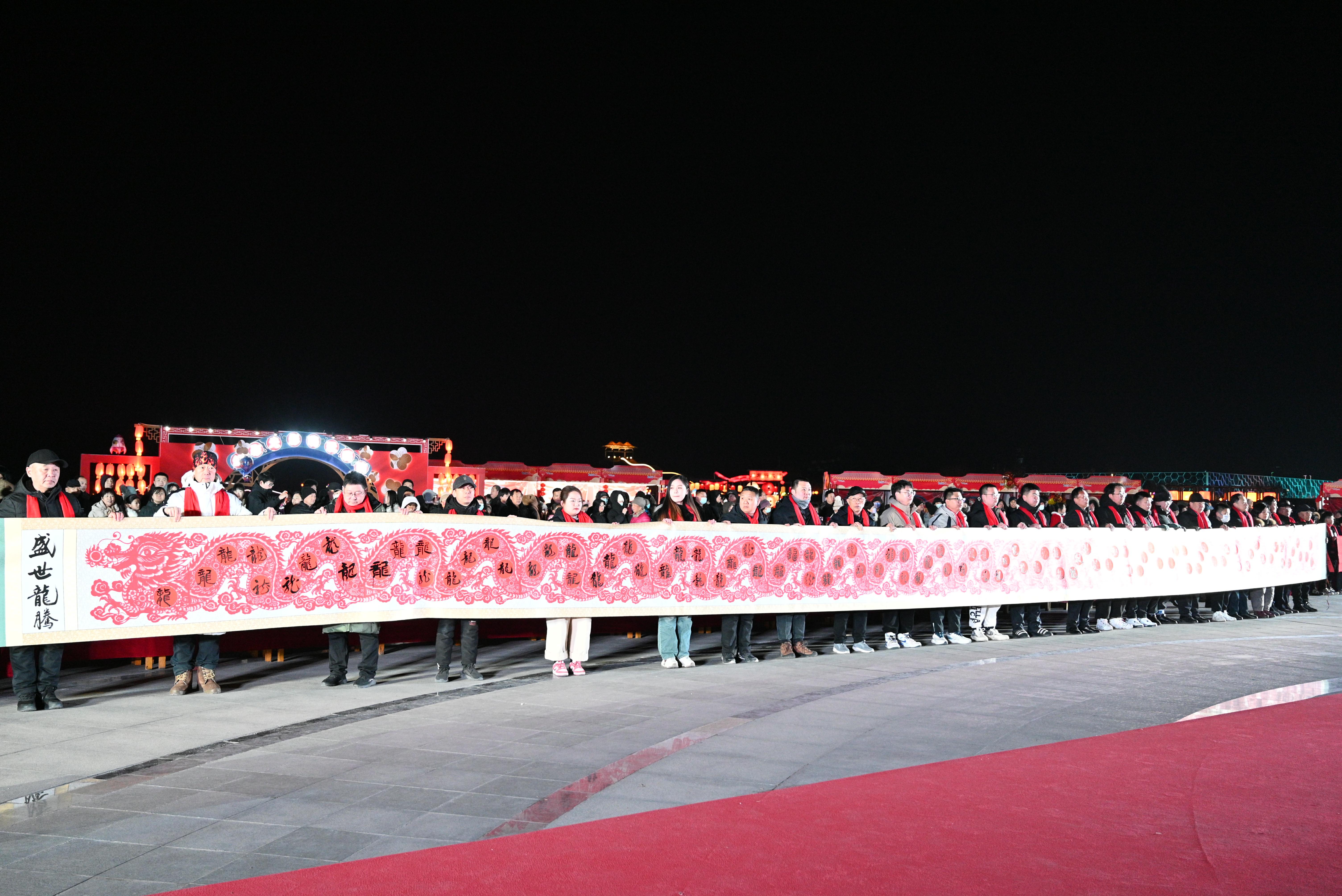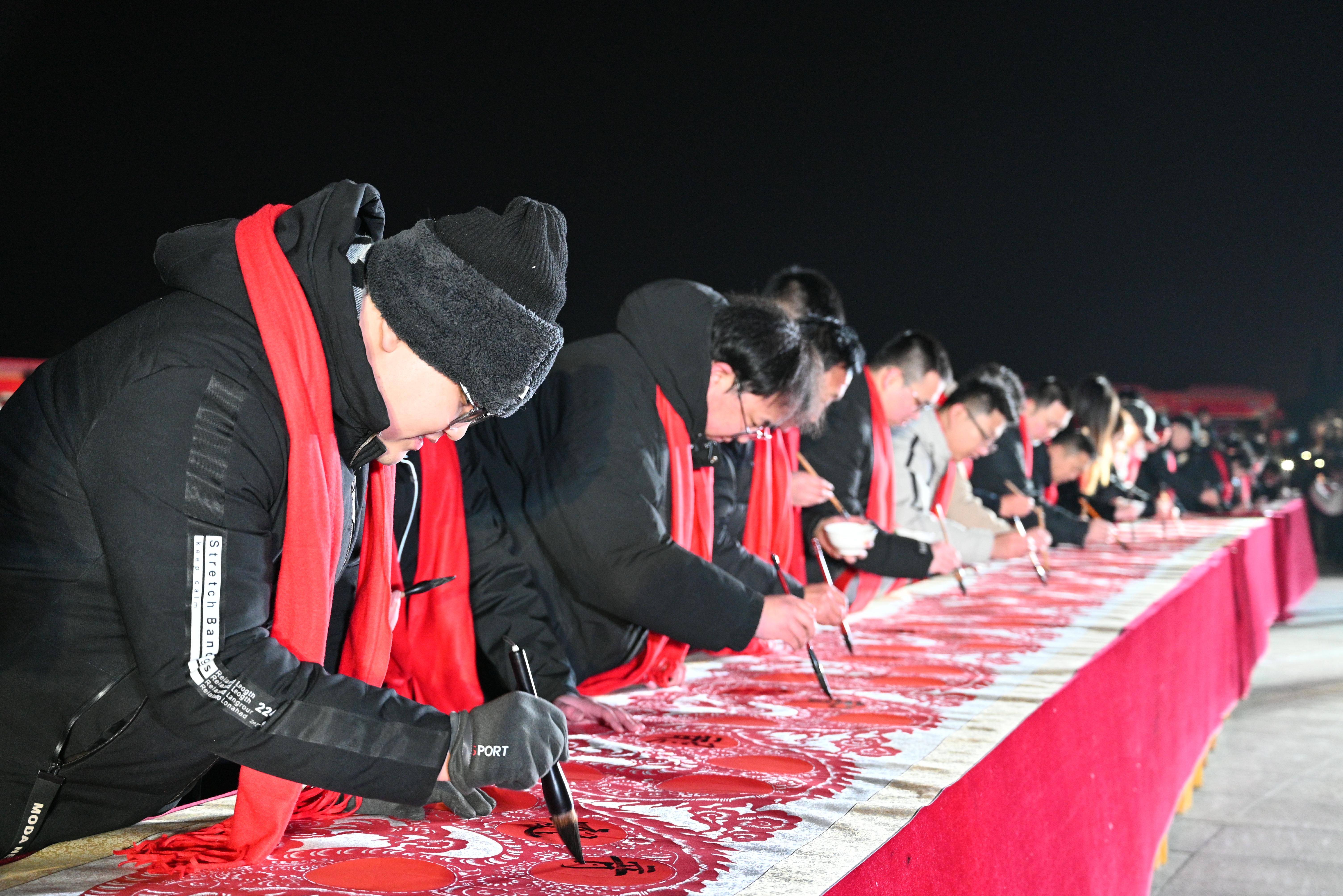 農歷臘月二十三,是中國北方“小年夜”。當晚,冀州區九州廣場上人頭攢動、熱鬧非凡。百余名書愛好者齊聚于此,一同在長達18米的祥龍剪紙上,用毛筆書寫“龍”字書法。不多時,一個個風格各異的“龍”字便躍然紙上,它們或遒勁有力、或瀟灑飄逸、或雋永俊秀……遠遠望去,整幅剪紙作品宛若一條巨龍蜿蜒盤旋,壯觀的景象和書法家們的精湛技藝,引得圍觀群眾點贊叫好。