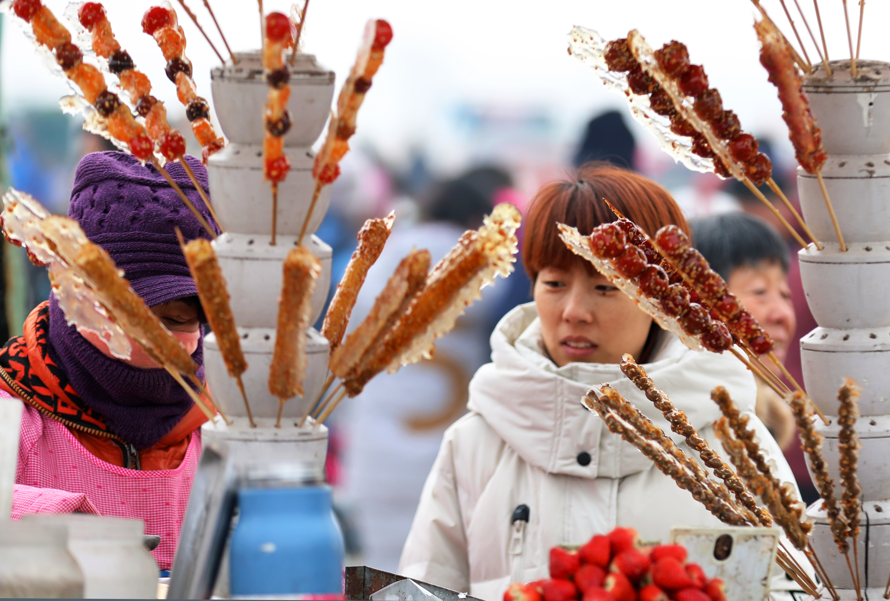 一個售賣干果的攤位旁圍滿了人,正忙著炒栗子的攤主告訴記者,每逢大集,他就在這擺攤賣干果、糖果等商品。“今天是年前最后一個集,趕集的人也多,來買糖果、干果,特別是瓜子和花生的人也多,比平常的生意好了不少。”