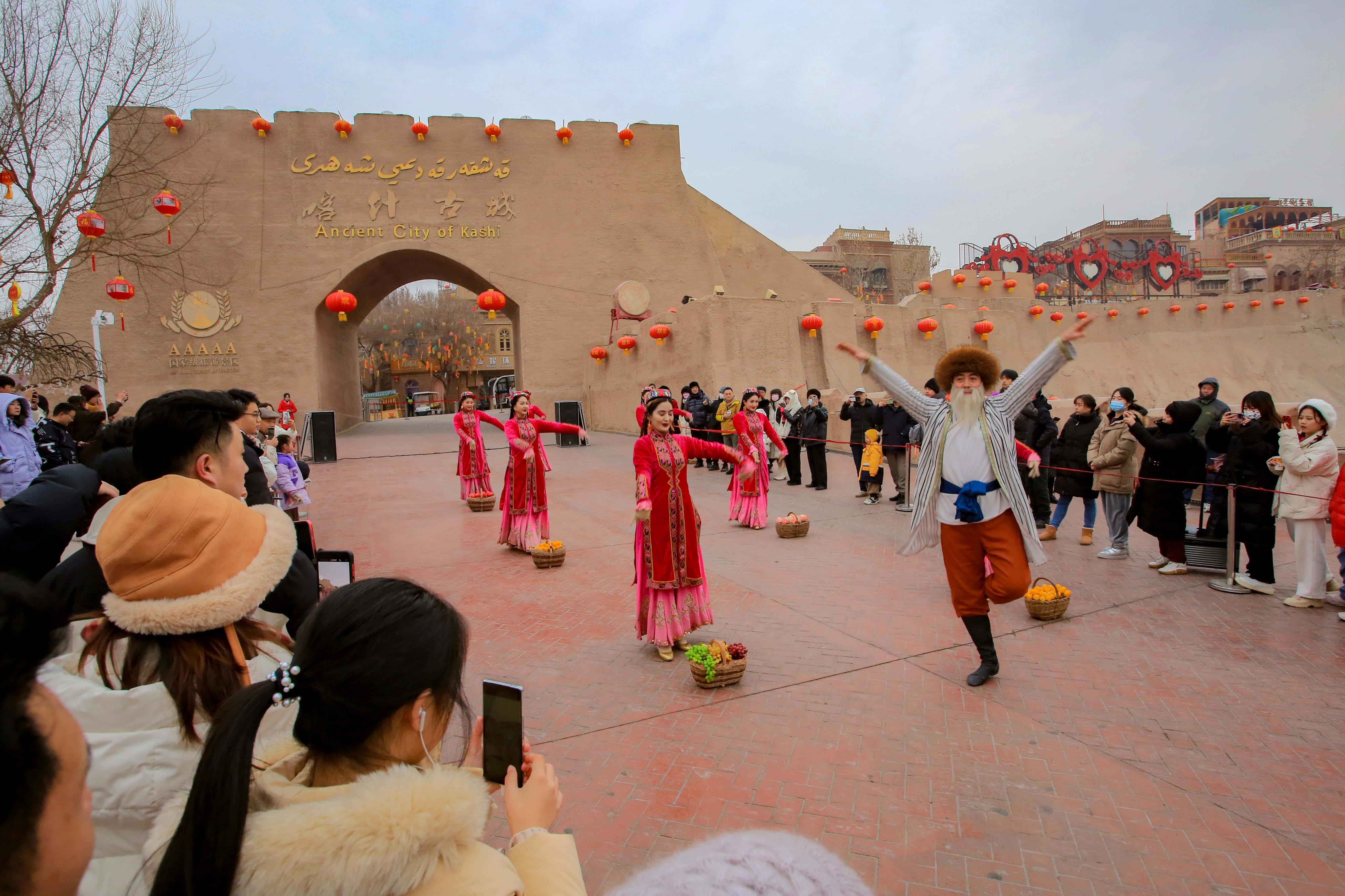 從山東來探親的游客孫中剛,不時駐足拍攝,“讓家人看看,在祖國的大西北,春節氛圍同樣喜慶。”在他的鏡頭里,有紅火的年味巴扎,有熱鬧的喀什古城,還有滿面笑容的居民。