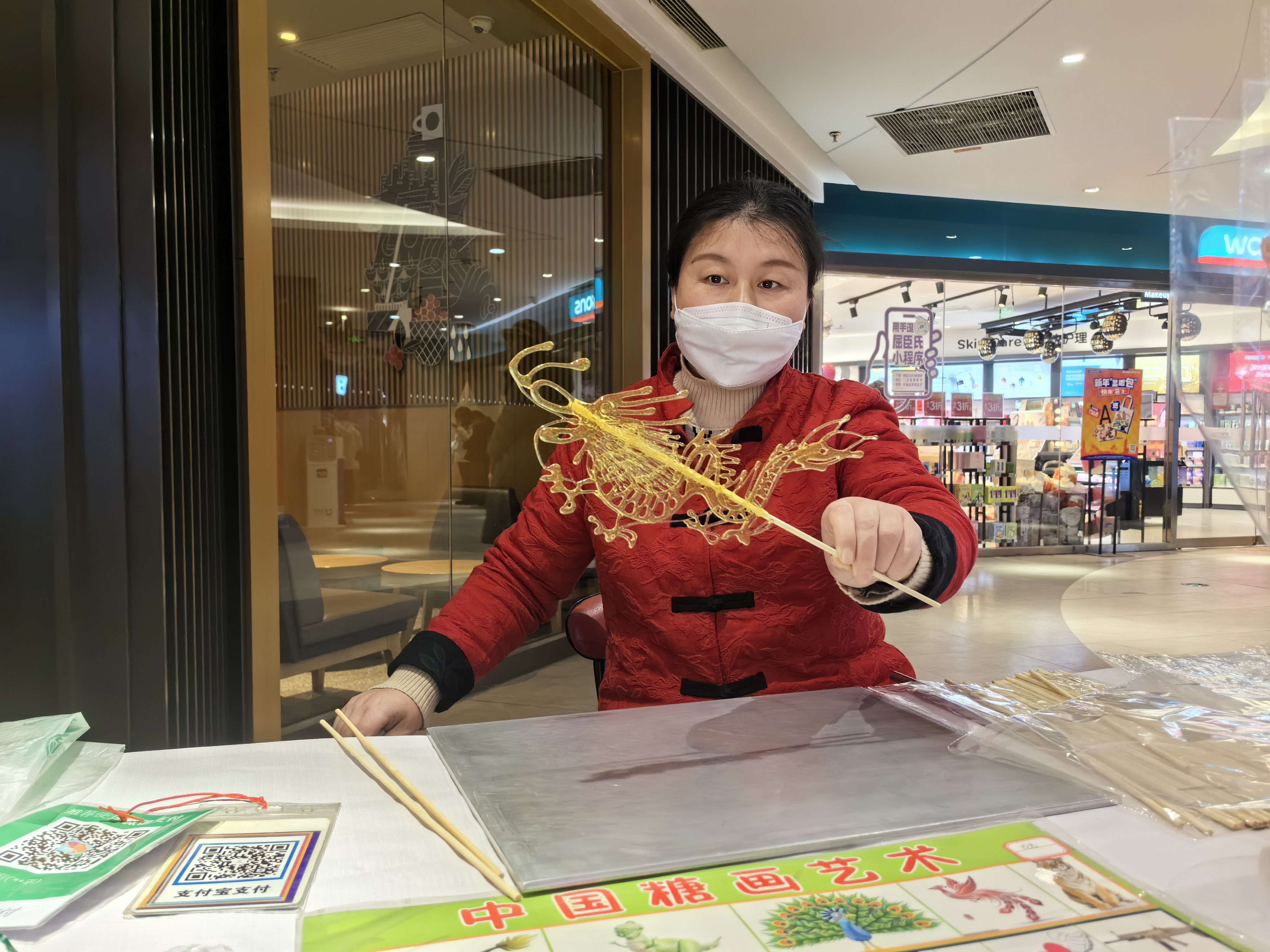 14日,記者來到匯中廣場。一走進廣場大廳,兩側的年貨市集上,非遺糖畫的攤位最是惹人注目。一個小爐,一口糖鍋,一柄銅勺、一把小鏟、一塊鋼板再加一捆竹簽,就是糖畫藝人的全部工具。只見藝人以銅勺為筆,以糖液作墨,手腕翻轉,糖液揮灑而下,片刻之間,一條中國龍就完成了。