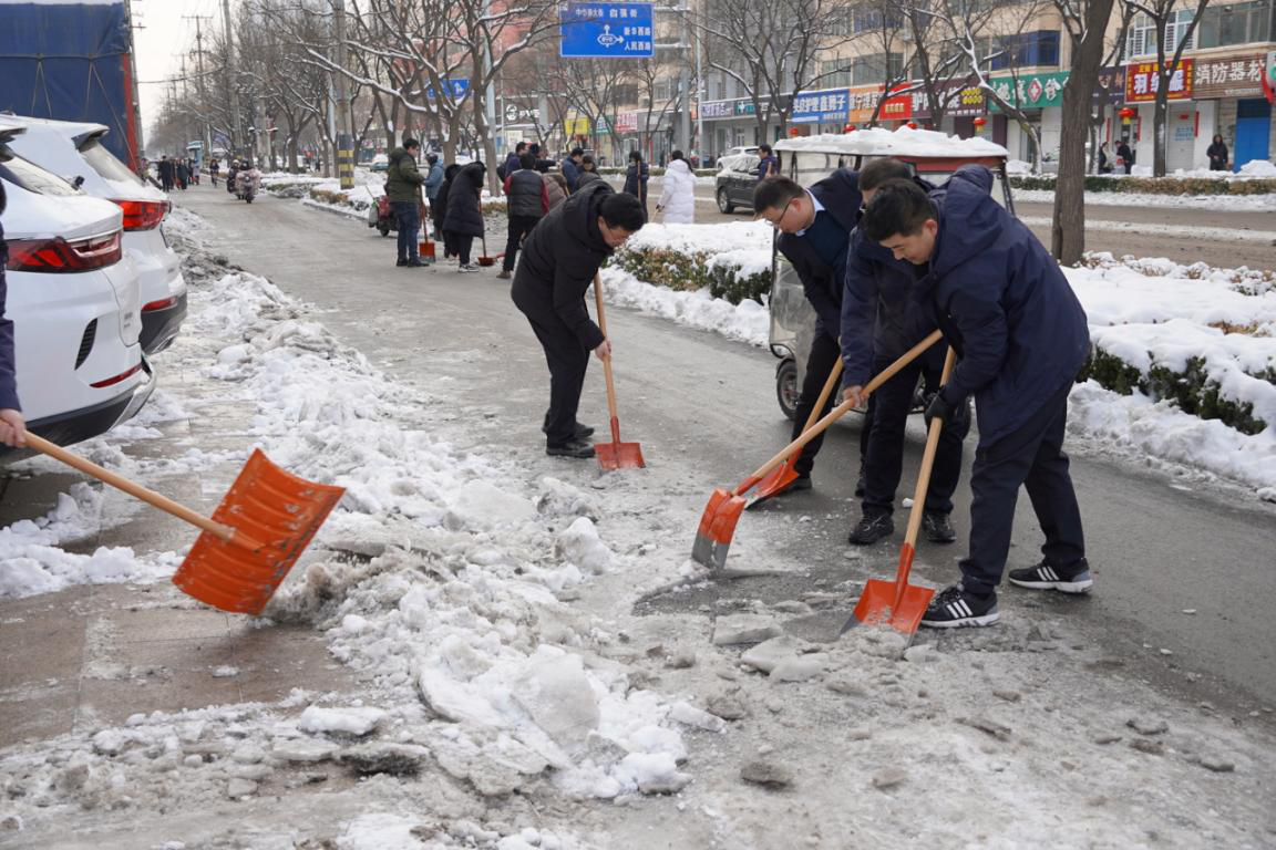 在市區和平西路,衡水移動70余名干部員工齊上陣,攜帶雪鏟、鐵鍬等除雪除冰工具,對營業廳門前、停車場、便道等公共區域進行全方位清理。他們幾人一組默契配合,縱然雙手凍得通紅,額頭依舊冒著熱汗,一邊清掃還一邊不忘提醒過往行人“小心路滑”“慢點,注意安全”,歷時一個多小時,他們清理出一段又一段干凈整潔的路面,“好久沒有這么暢快的勞動了,不過看著大家在這段路上行走、騎車不用再小心翼翼了,累得腰疼也值了。”小王一邊擦汗一邊說著。