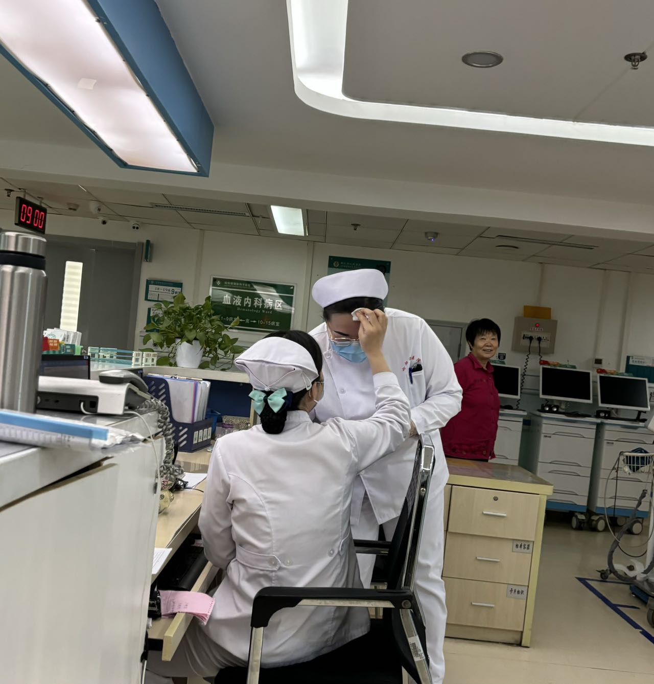 哈院血液內科是衡水市醫學重點發展學科,眾多的住院患者讓醫護人員春節以來的工作量增加了至少五倍。圖為血液內科護士于倩倩為累得滿頭大汗的趙勃珠擦去額頭的汗水,大家互相激勵,共同服務好患者。