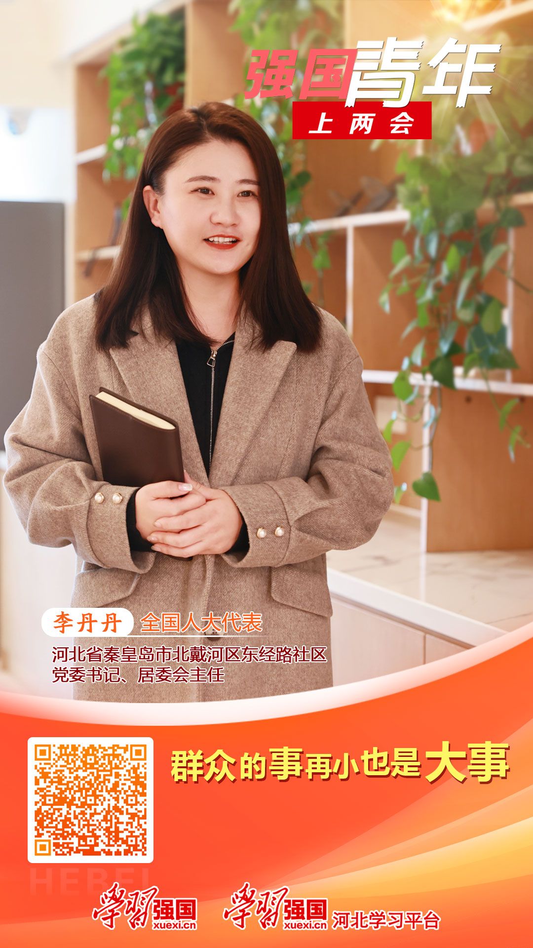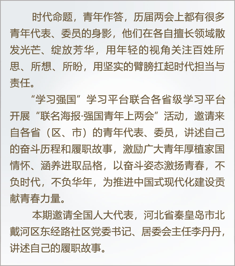 全國(guó)人大代表李丹丹:群眾的事再小也是大事。對(duì)于90后的我來(lái)說(shuō),挺膺擔(dān)當(dāng),在新時(shí)代新征程上留下無(wú)悔的青春足跡,才能更好地書(shū)寫(xiě)出為民服務(wù)的多彩人生。我們將新時(shí)代文明實(shí)踐的微陣地延伸到了居民小區(qū),通過(guò)意見(jiàn)征集、協(xié)商議事等形式,聚焦群眾需求,我們推出了“幸福鄰里匯”助老公益服務(wù)項(xiàng)目,打造了一月一主題的“鄰里集市”,開(kāi)設(shè)了社區(qū)食堂,整合轄區(qū)多方資源,不斷優(yōu)化康復(fù)輔具租賃、適老化改造、上門(mén)助浴、上門(mén)體檢、上門(mén)理發(fā)等各類(lèi)公益志愿服務(wù)功能,持續(xù)增進(jìn)民生福祉。