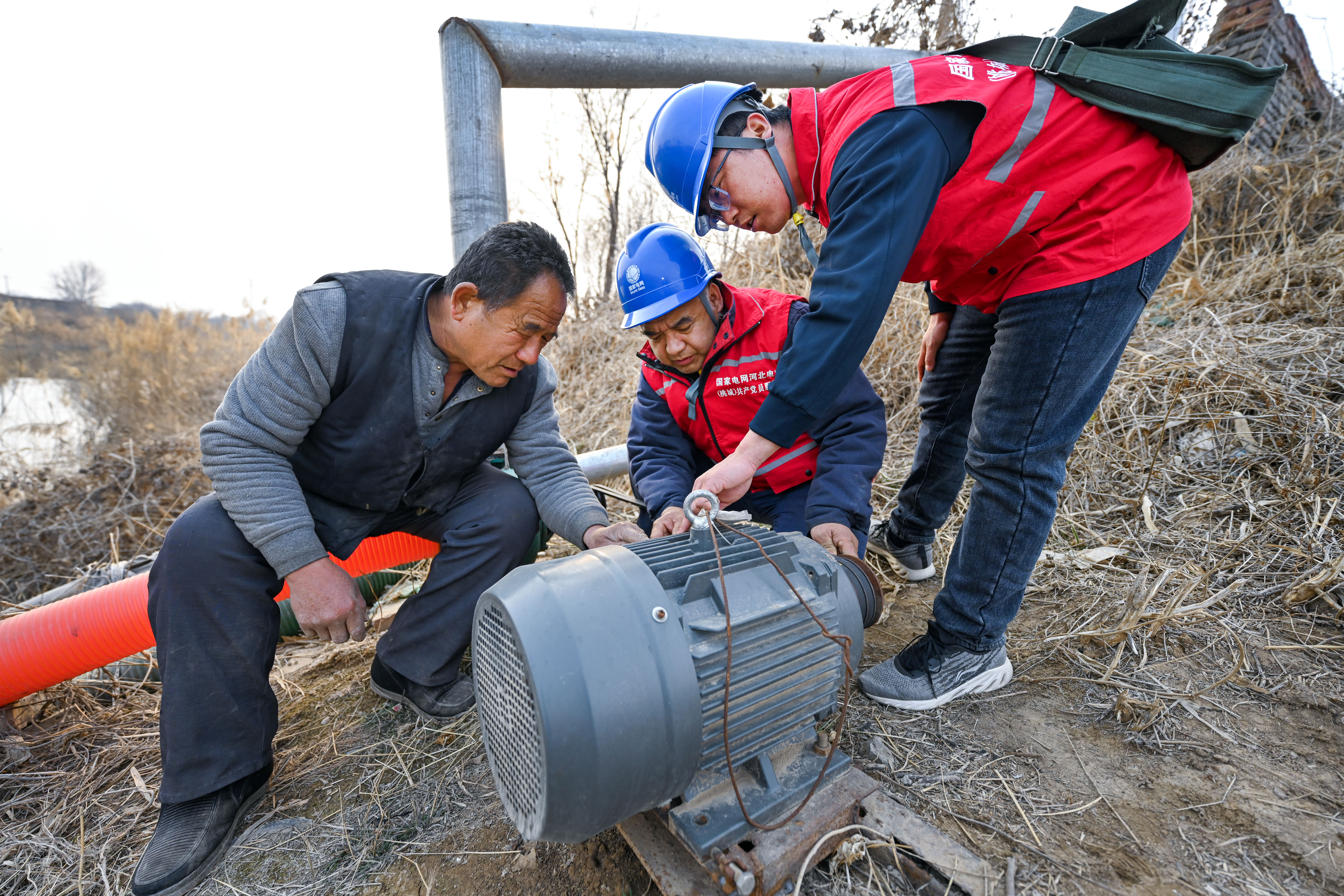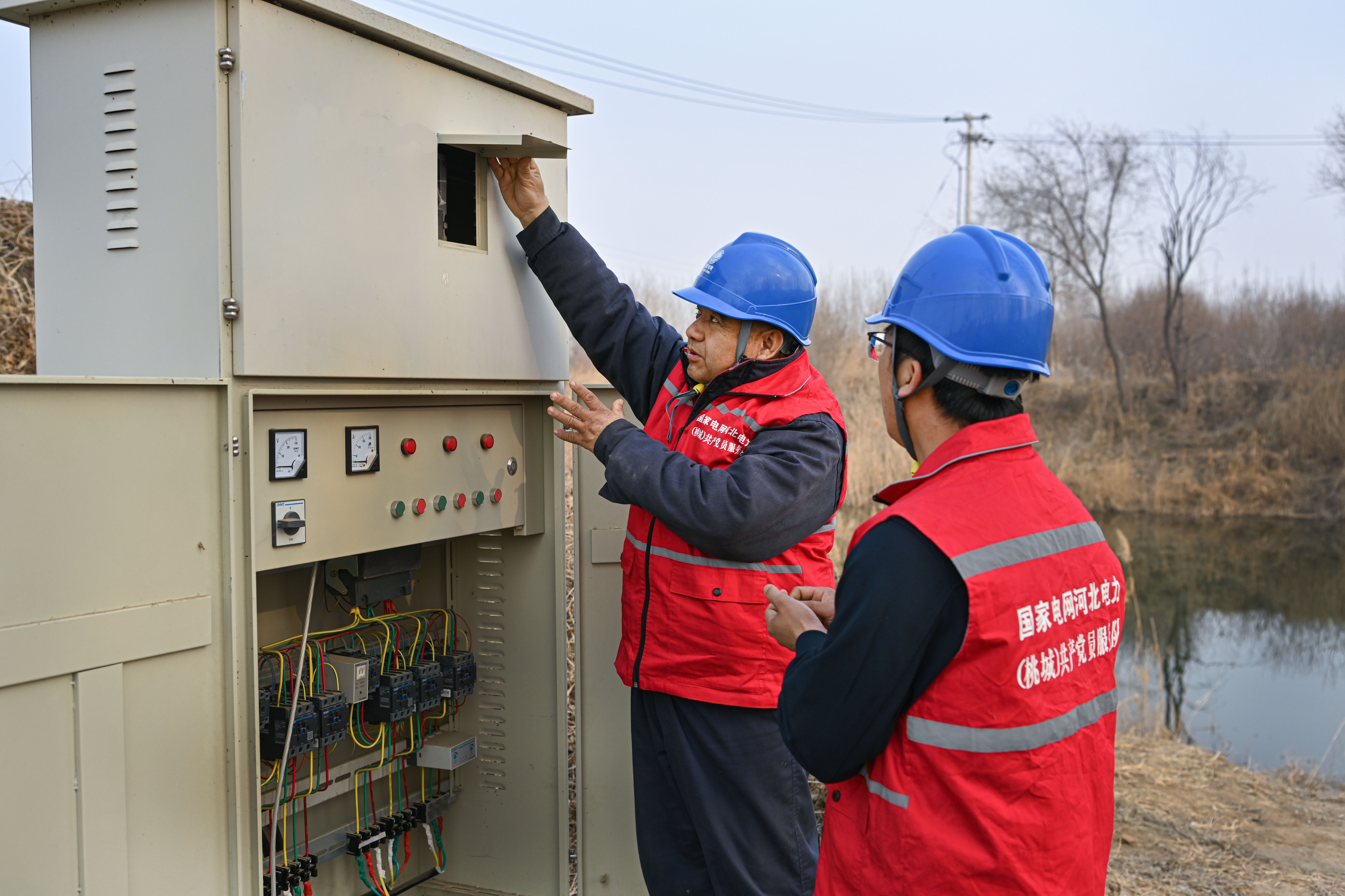 3月6日,國網(wǎng)衡水市桃城區(qū)供電公司黨員服務(wù)隊隊員張延文和吳新華正在桃城區(qū)鄭家河沿鎮(zhèn)英莊村檢查10千伏550國莊線運(yùn)行情況和附近揚(yáng)水站電機(jī)用電情況。“一切運(yùn)行正常。”張延文說。