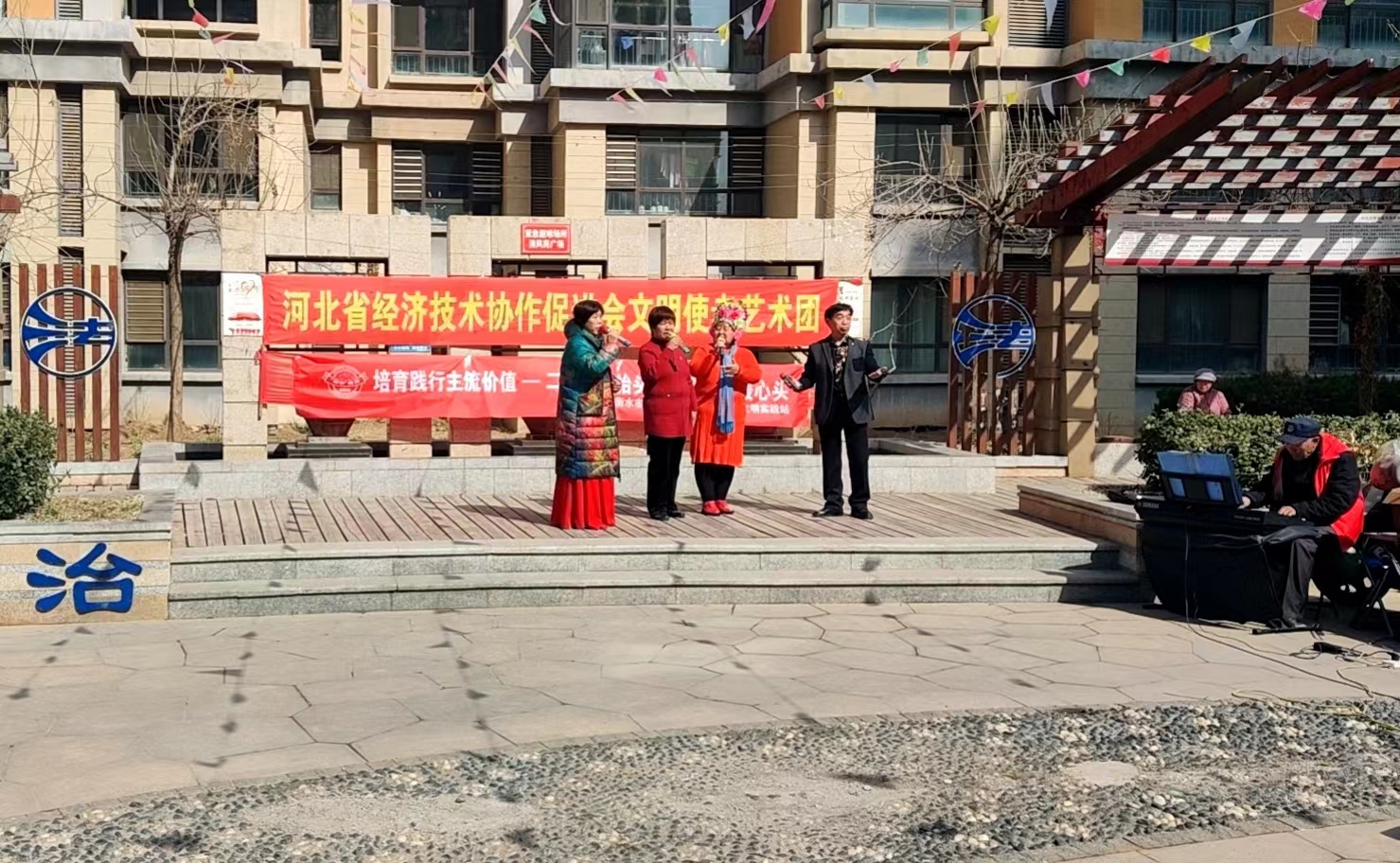 不遠處,來自裕康社區和河北省經濟技術協作促進會文明使者藝術團的志愿者,在小區廣場開展“二月二龍抬頭 志愿服務暖心頭”文藝匯演活動,為居民獻上了一場精彩的演出。舞臺一旁,準備上臺表演廣場舞的居民馮淑清正在熱身,她樂呵呵地介紹,她和幾個志同道合的鄰居組成了一支舞蹈隊,她們用舞蹈演繹別樣的社區幸福生活。“以前我們是自娛自樂,現在社區搭臺,我們有了屬于自己的舞臺,今后還要創作出更多更好的節目。”馮淑清表示。