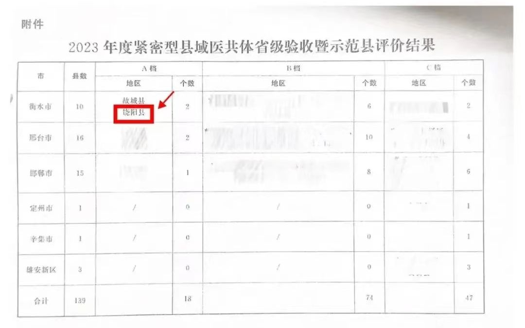 日前,河北省醫改辦等四部門印發《關于2023年度緊密型縣域醫共體省級驗收暨示范縣評價工作情況的通報》,饒陽縣獲評A檔,被命名為“2023年緊密型縣域醫共體建設省級示范縣”,并對饒陽縣人民醫院醫療集團慢病管理中心的規范化服務做法給予肯定。