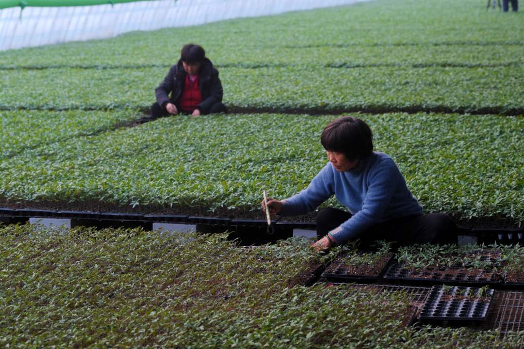 育苗棚里工人正在忙碌勞作。崔佳棟 攝
