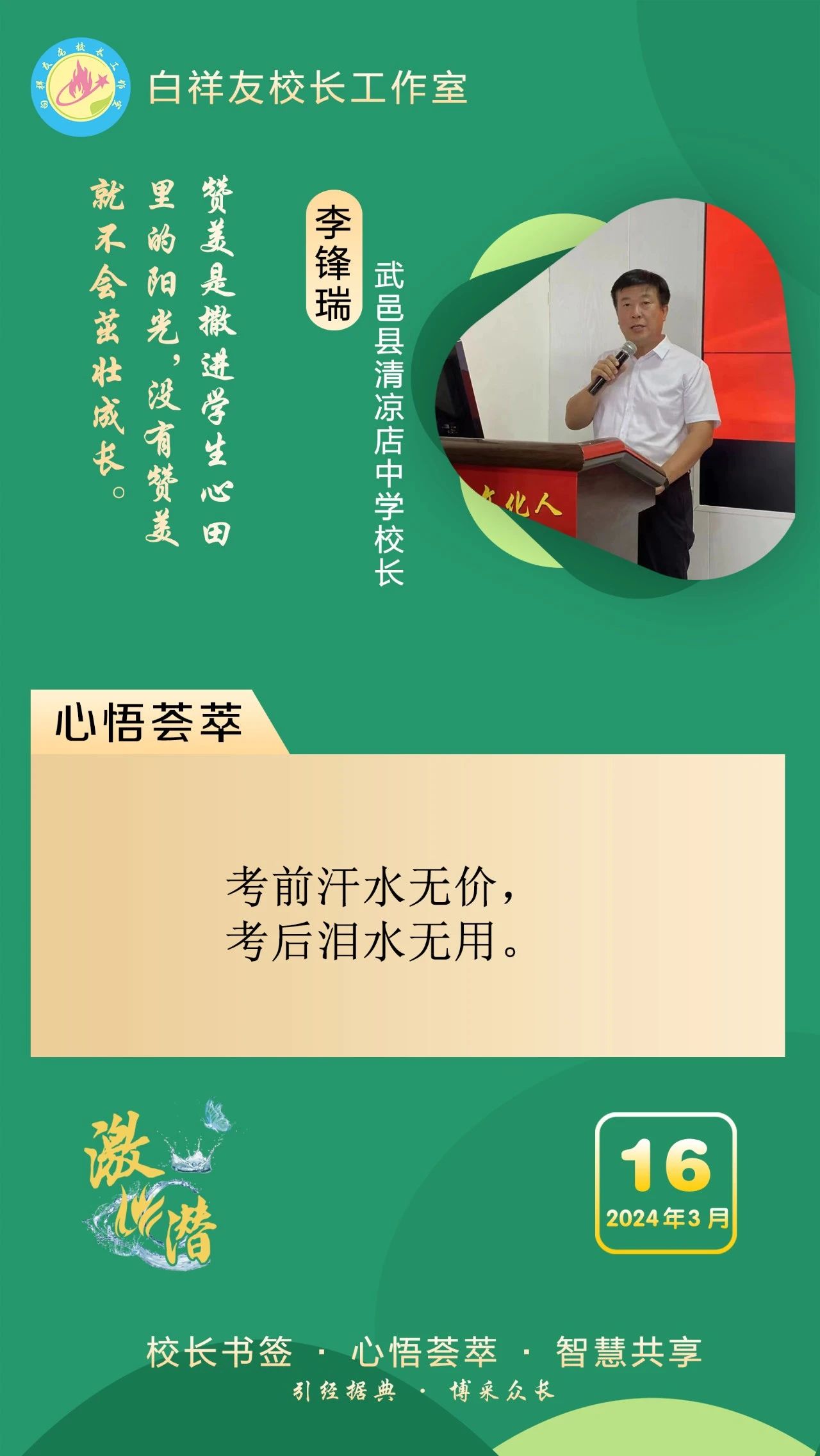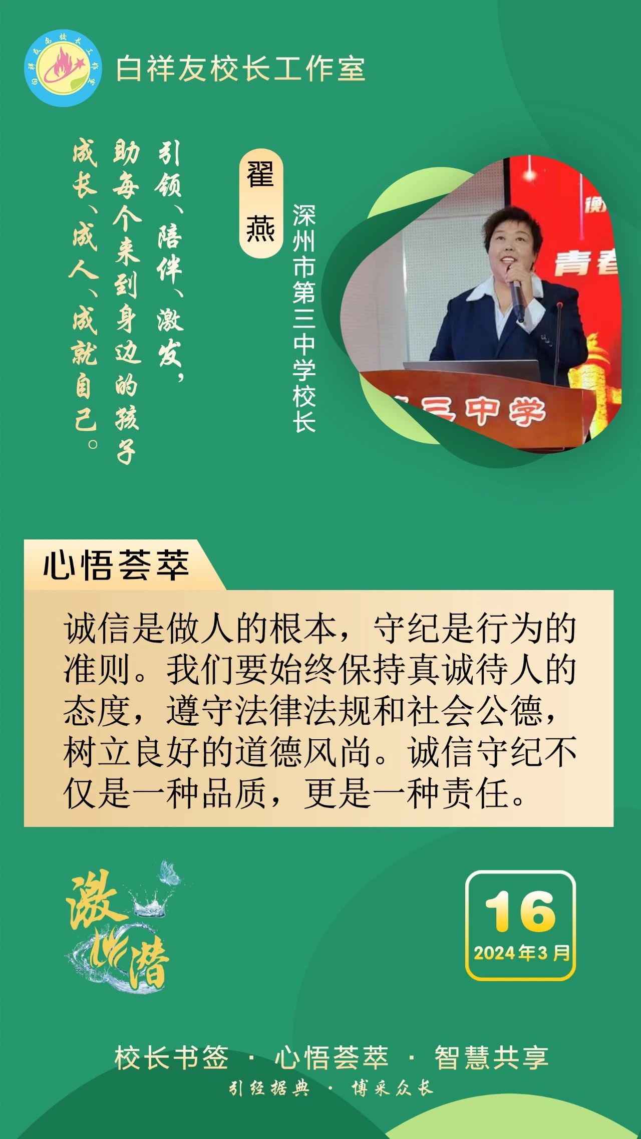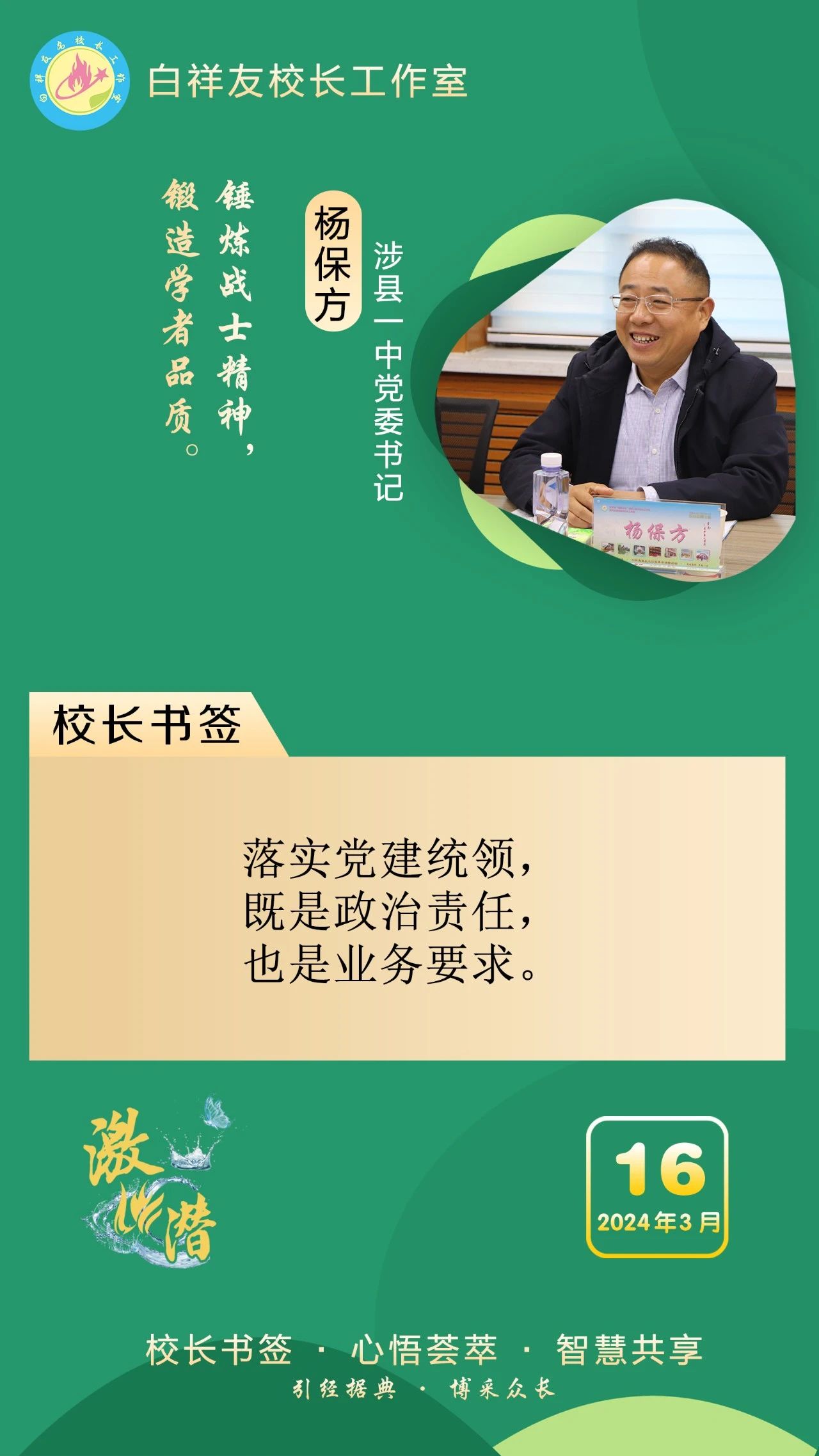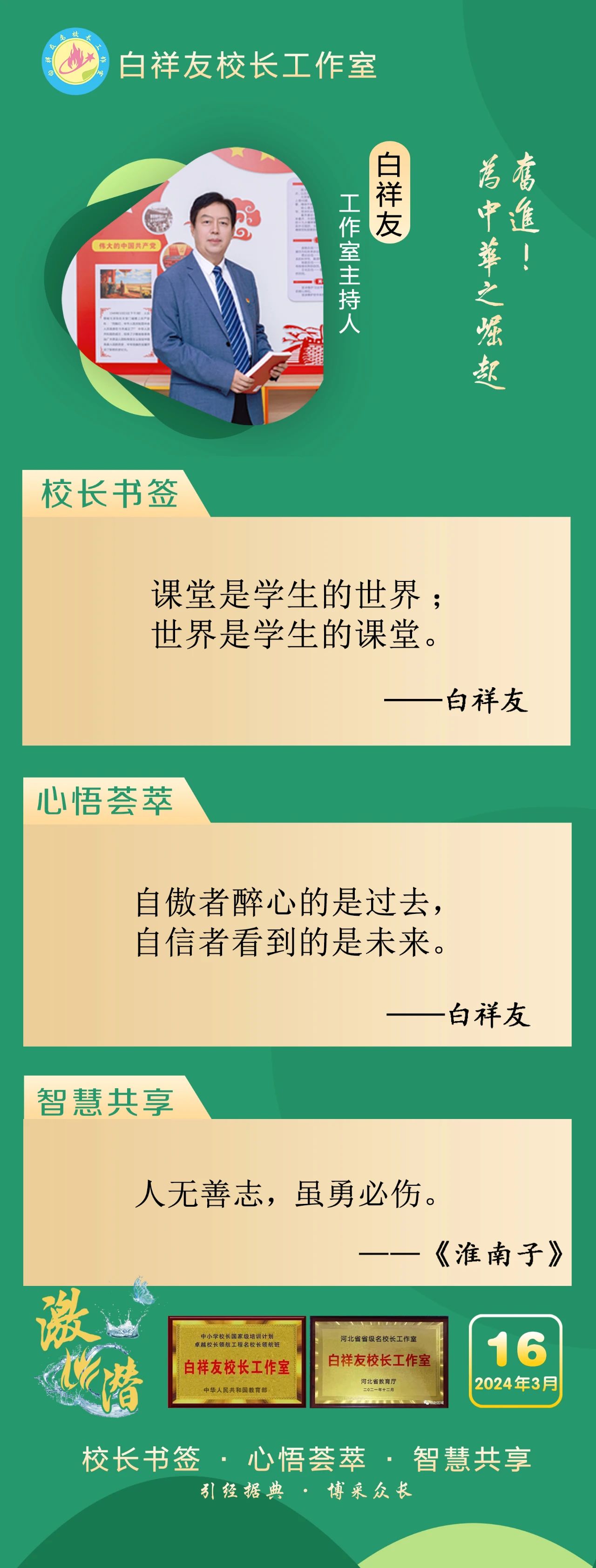 2019年4月,教育部“國培計劃”名校長領航工程“白祥友校長工作室”成立。工作室主持人,衡水市教育局督學、衡水十三中黨委書記白祥友,始終秉承教育報國的初心,時刻牢記為黨育人、為國育才的教育使命,提出了“奮進!——為中華之崛起”的校訓,踐行“解放生命,激爆潛能,超越每刻,卓越一生”的激潛教育理念。