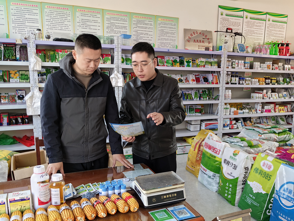 工作人員(右)向農(nóng)資經(jīng)營者宣傳農(nóng)產(chǎn)品安全生產(chǎn)知識。王政 攝