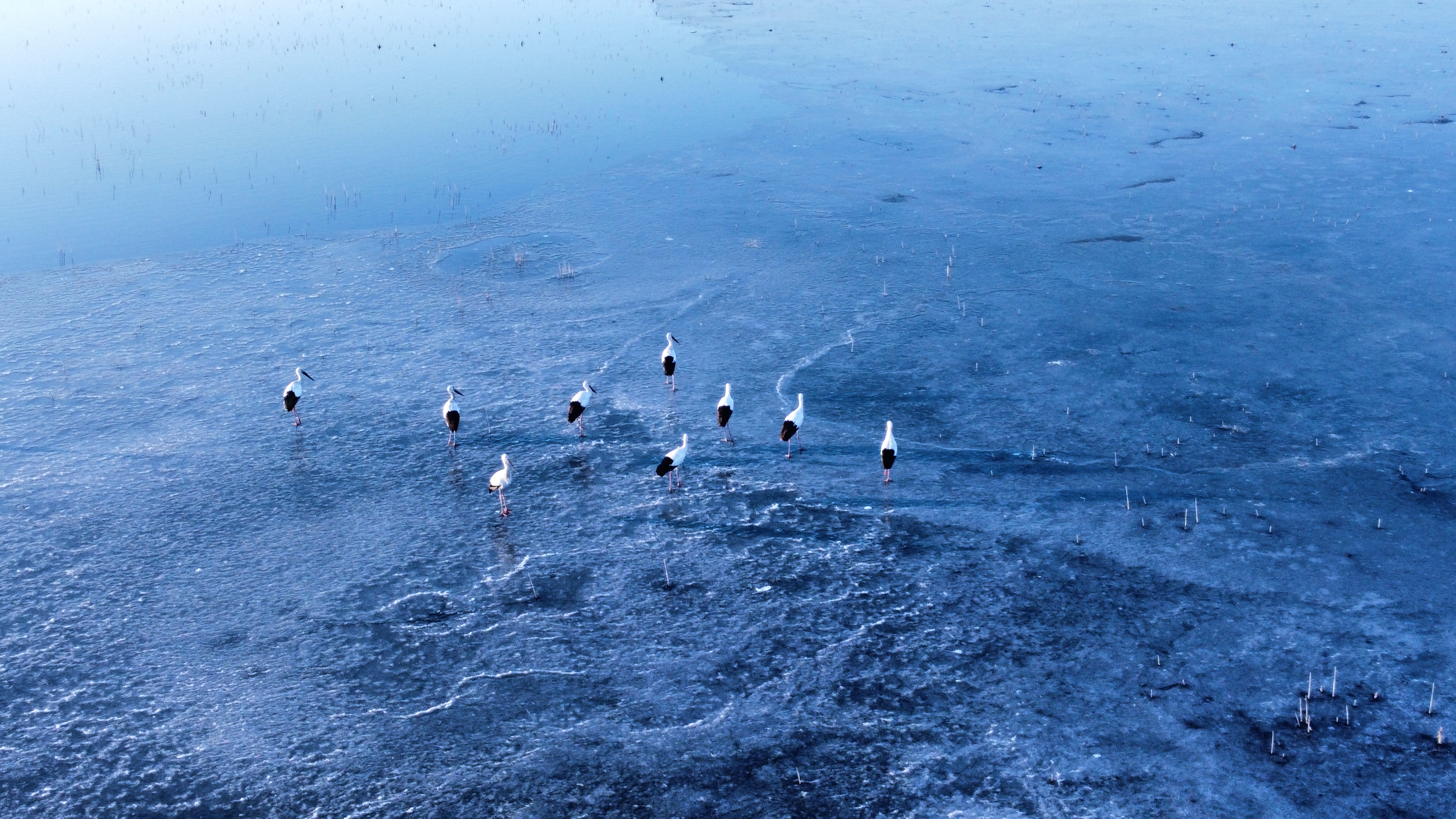 3月20日,衡水湖國家級自然保護區工作人員進行鳥類調查監測時,在湖區淺水處發現一只國家一級保護動物黑鸛。在它旁邊,五只蒼鷺簇擁著一只國家一級保護動物東方白鸛。東方白鸛和黑鸛雖然都為涉禽,但同框覓食的情況十分罕見。經查閱近年記錄,衡水湖曾于2018年監測到黑鸛,其后近7年未曾有記錄。