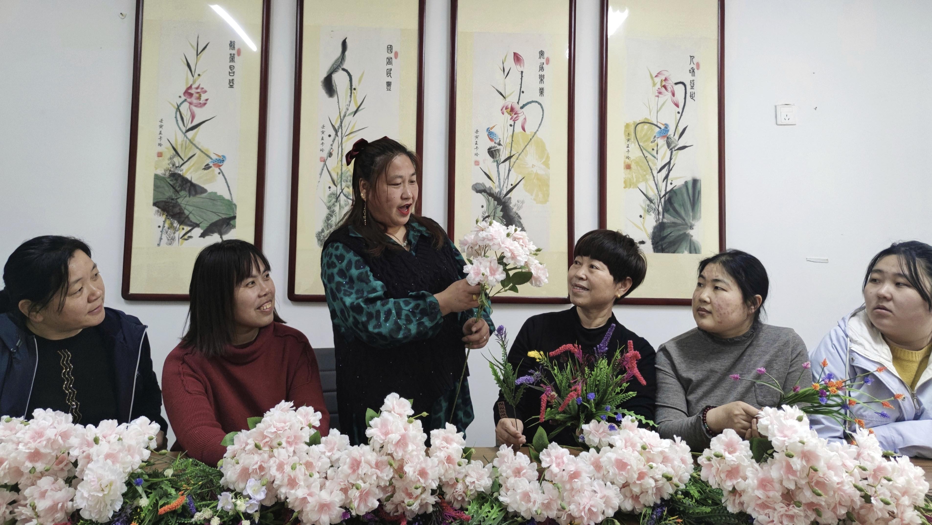 據了解,高振喜是一名返鄉婦女,曾在外務工10年。這兩年,她看到家鄉的發展變化十分喜人,尤其是當地婦聯組織積極鼓勵和支持農村婦女發展庭院經濟,給了她很大信心和勇氣,于是決定回鄉創業。2023年10月,她利用自己掌握的仿真花插花、銷售等相關技術和渠道,大膽嘗試在自己家建立起插花小作坊,并手把手教授村里幾個婦女學習插花操作手法,為她們提供就業機會。