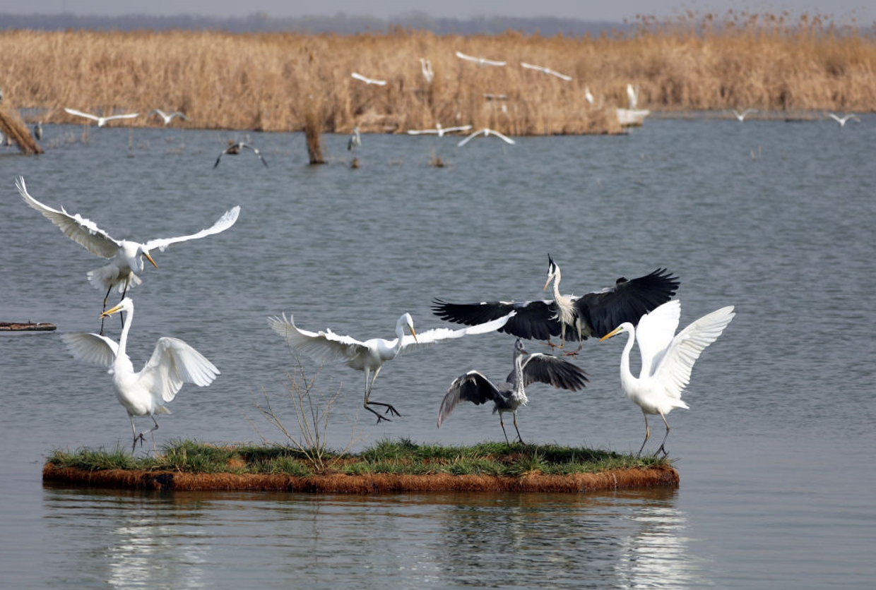 大白鷺、蒼鷺等鳥兒飛落在春季的衡水湖上。張凱 攝