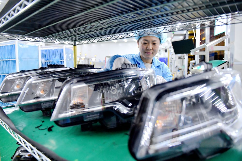 3月25日,工作人員在阜城縣一家汽車配件生產企業的生產車間整理汽車前組合燈。??
