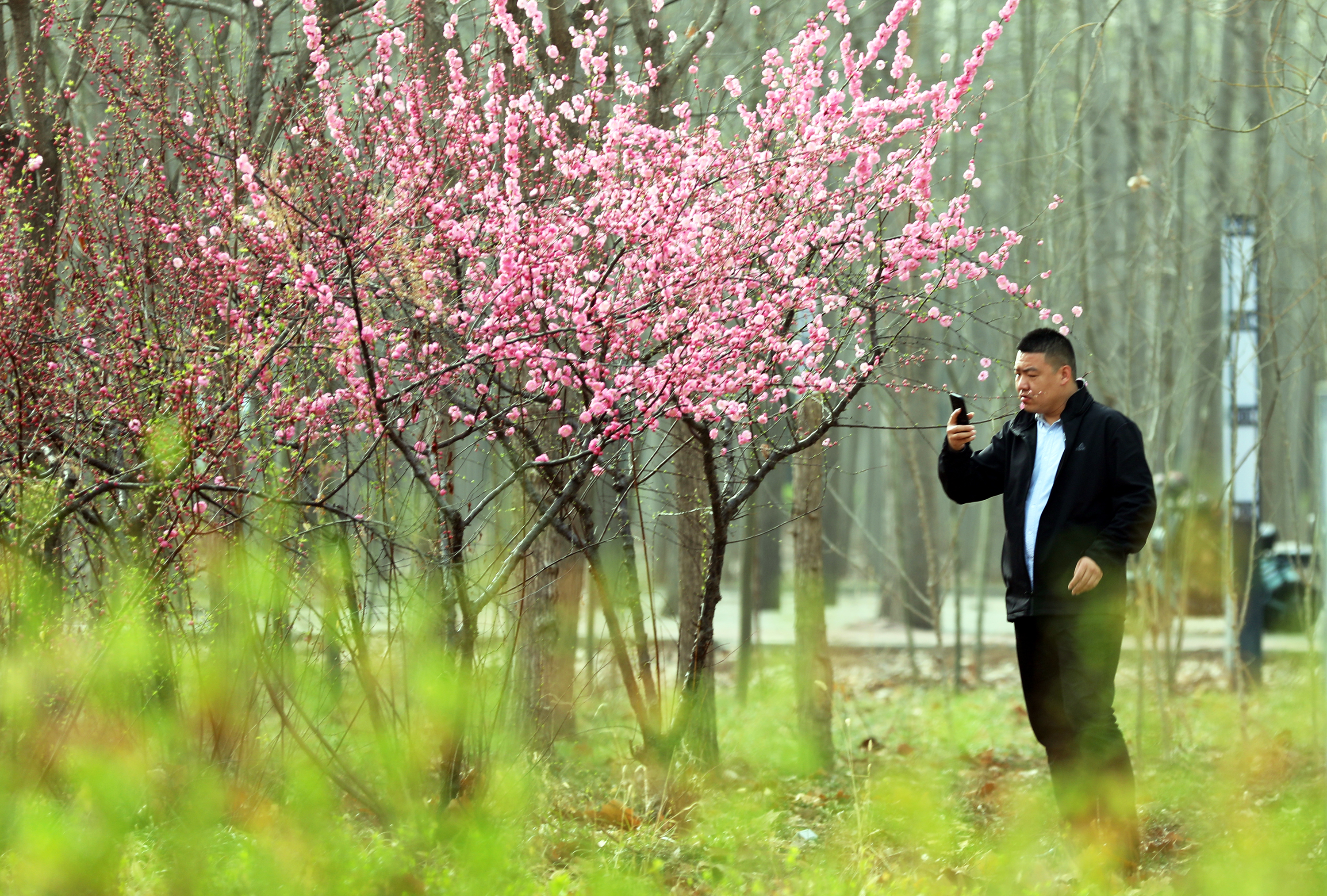 在創業公園,隨處可見三三兩兩的市民前來散步賞花。家住恒大城的市民蔡女士就是其中一位。記者遇到她時,她正和朋友們在盛開的榆葉梅處拍攝短視頻:“聽說這里的榆葉梅開得很好,趁著天氣好,出來拍視頻,發個朋友圈。”