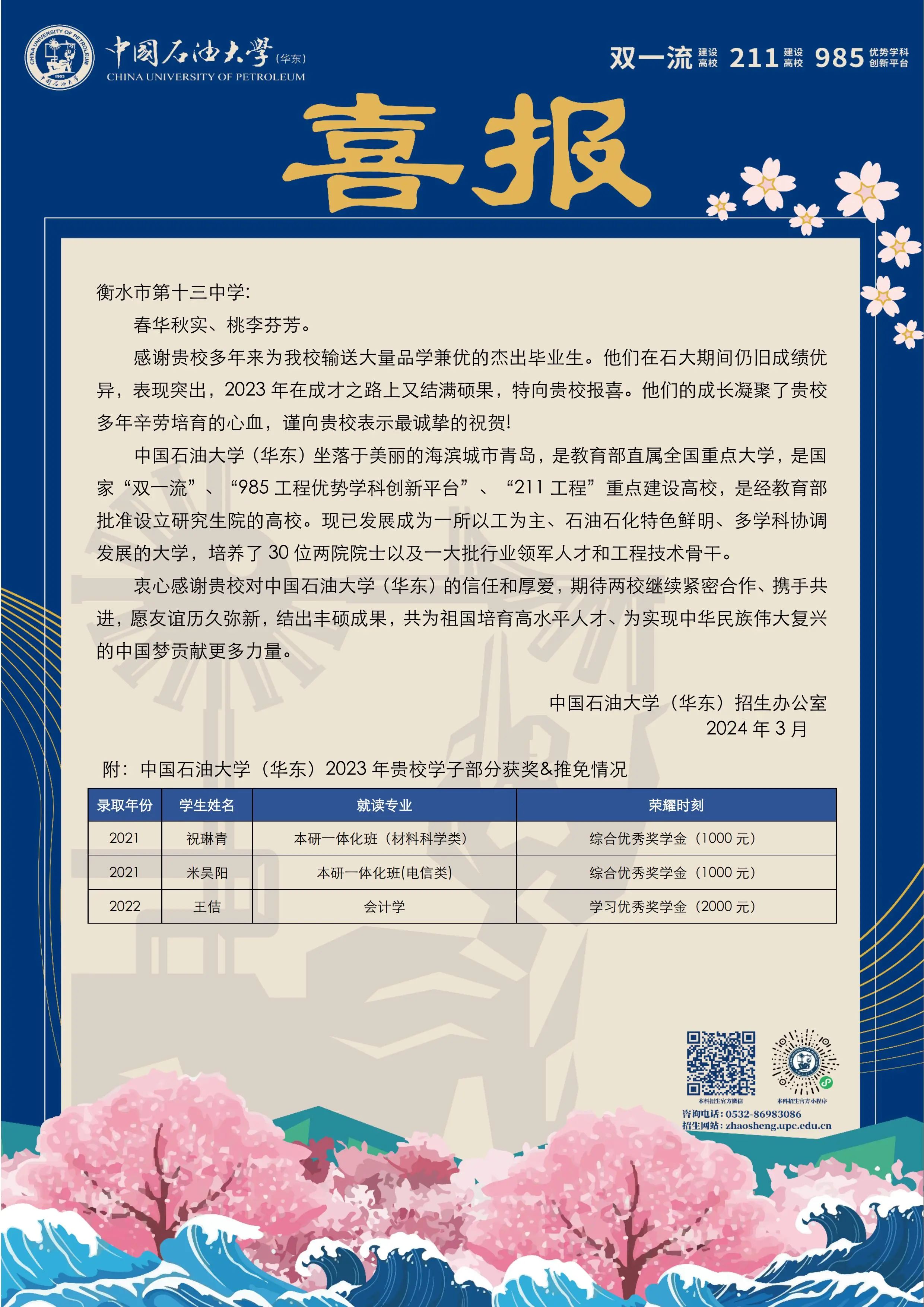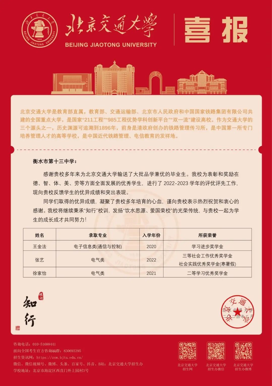 春華秋實,桃李芬芳。春日來信,喜報頻傳。近日,北京交通大學、中國石油大學(華東)分別向衡水十三中發來喜報,祝賀十三中畢業生在大學期間成績優異、表現突出。喜報中提到,十三中優秀畢業生王金法、張藝、徐家怡、祝琳青、米昊陽、王佶等獲得獎學金榮譽。