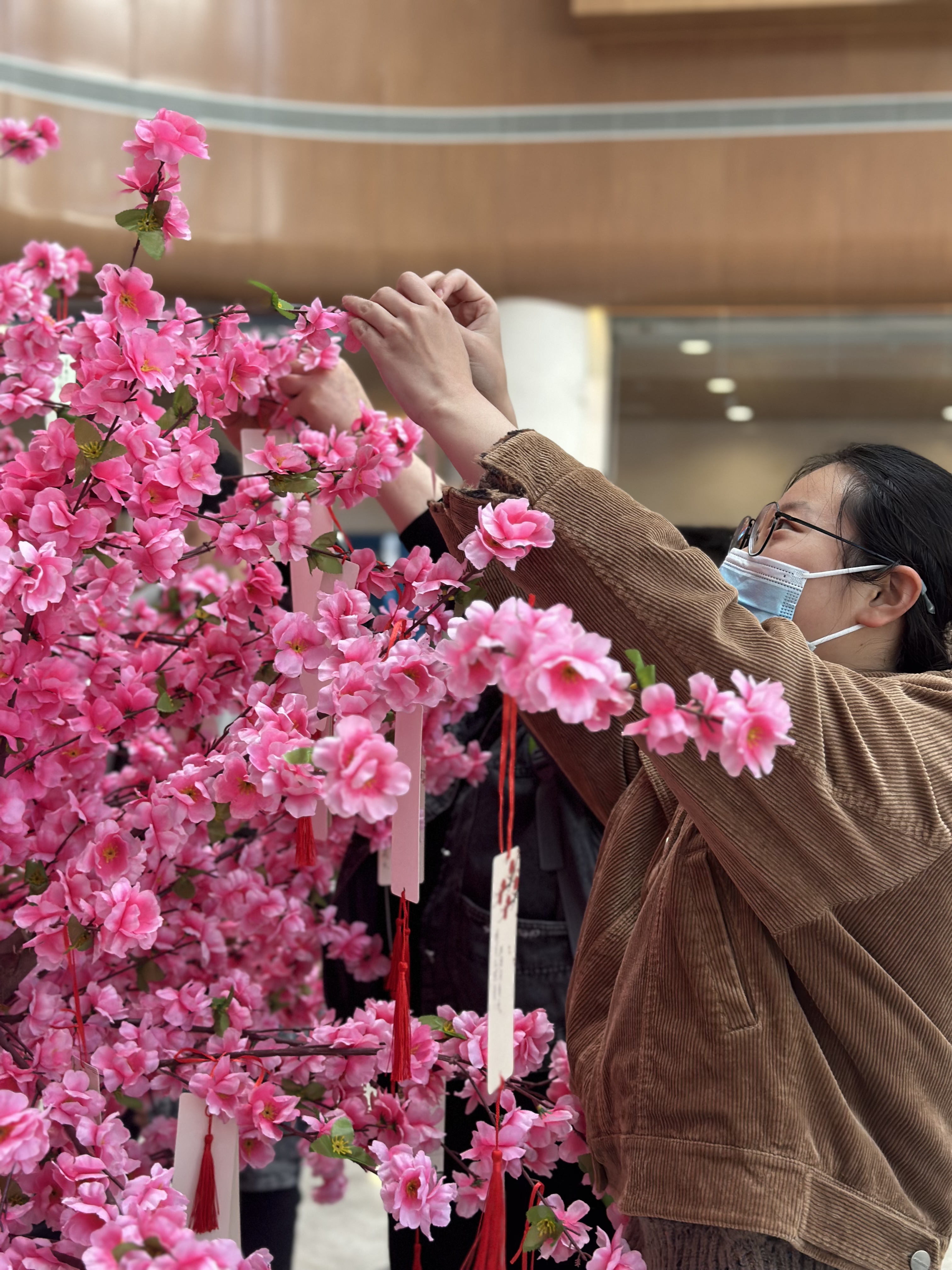 此次活動以桃花為背景,館員為讀者分發(fā)卡片,讀者將自己抽取到的關鍵字與作答的詩句寫到卡片上,并掛到桃花樹上。“人間四月芳菲盡,山寺桃花始盛開……”一句句不同朝代的詩句紛至沓來,長長短短,或熟悉或生疏,此時讀者們被這些詩詞歌賦所吸引,熱情高漲,詩意縈懷,不禁沉浸到一場精彩的詩詞盛宴中。