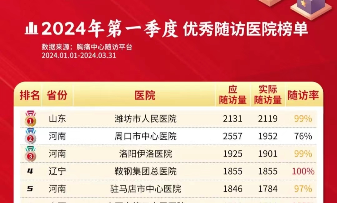 近日,中國胸痛中心公布對兩千多家中心單位ACS(急性冠狀動脈綜合征)患者隨訪工作第一季度考評結果,剛剛被授予“中國標準版胸痛中心單位”的衡水市第五人民醫院以100%的隨訪率榮列優秀隨訪醫院榜單,打響授牌后中心工作的“起跑槍”。
