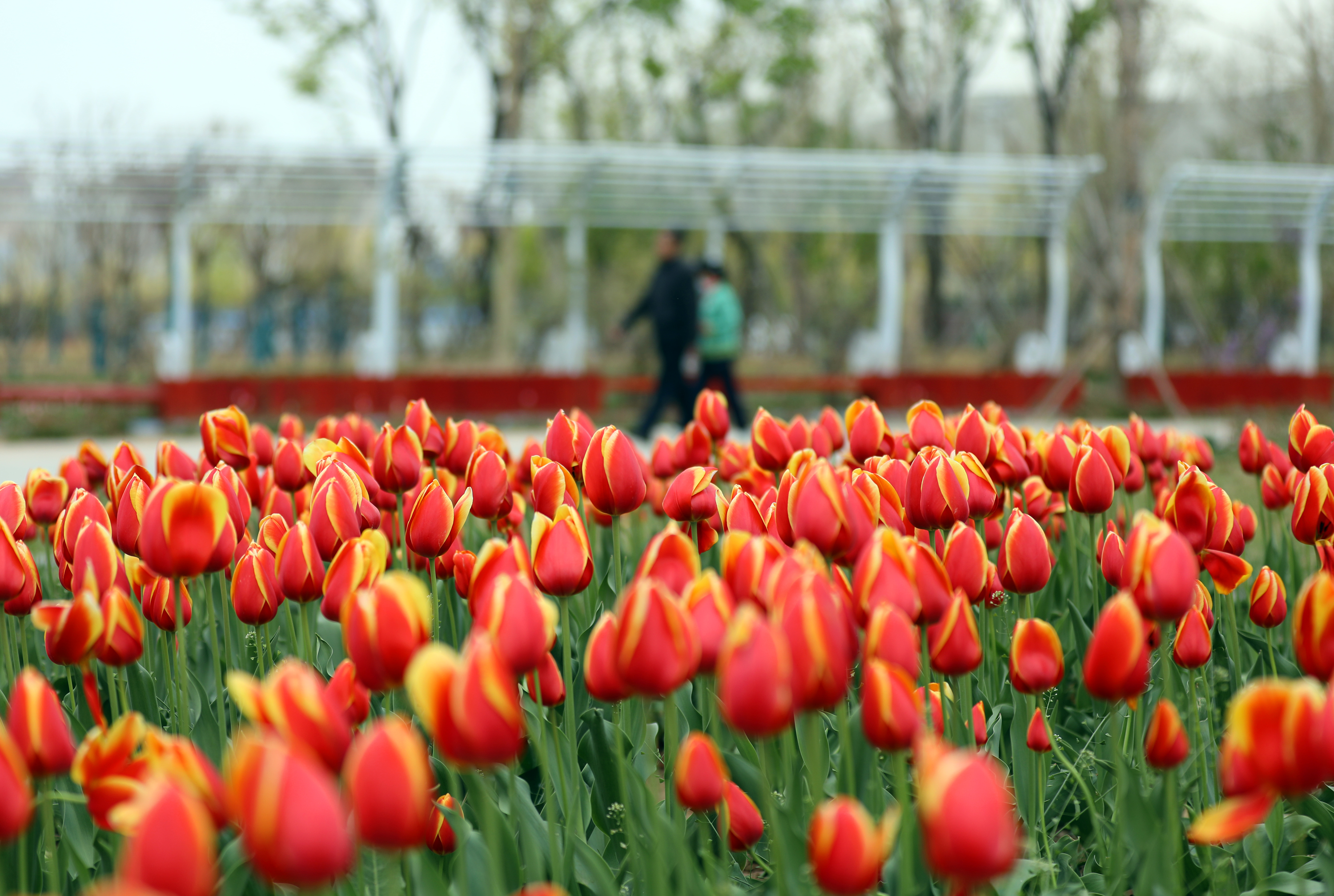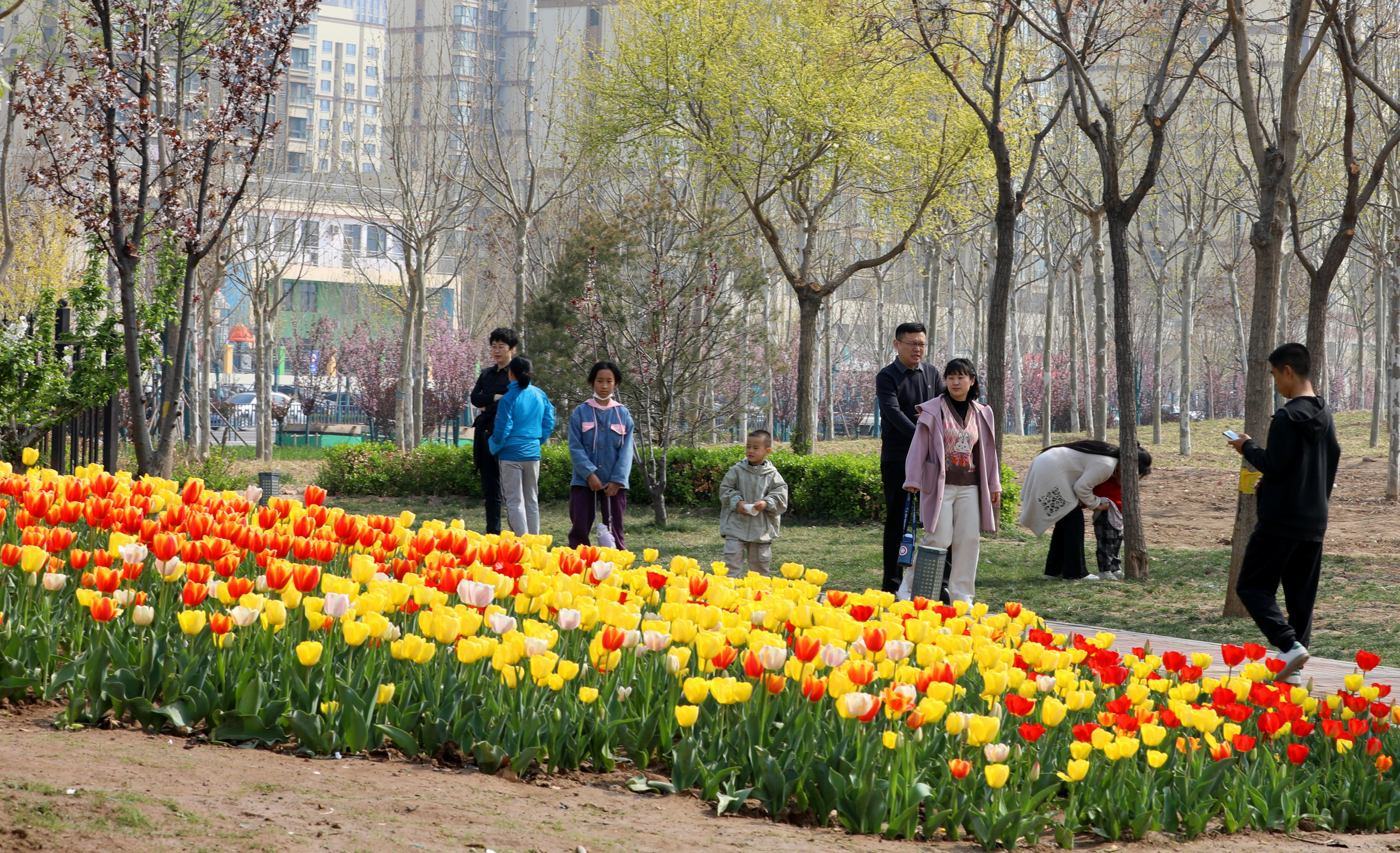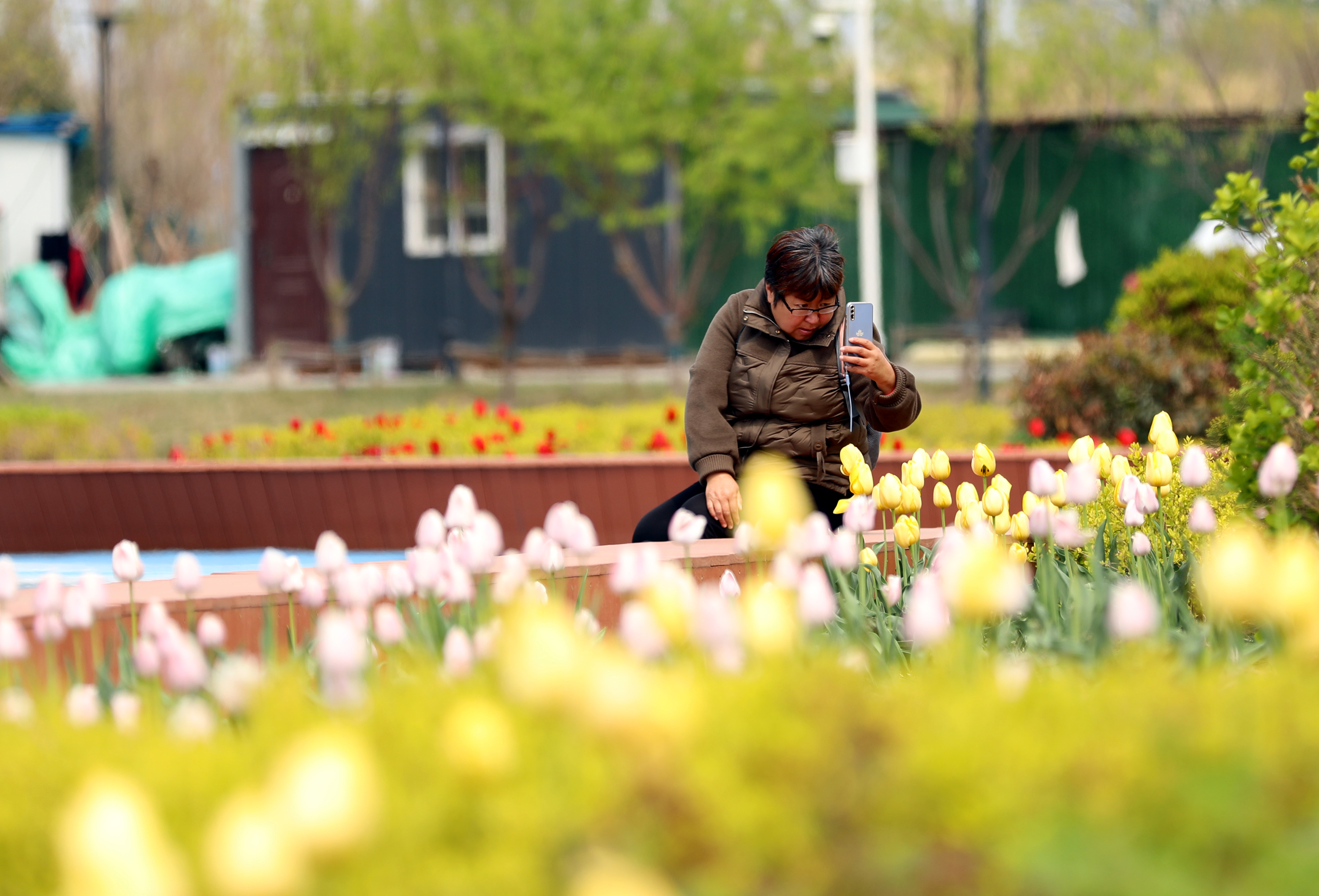 沿著公園的游步道走去,一朵朵、一叢叢的郁金香映入眼簾。在微風(fēng)的吹拂下,郁金香輕盈舞動(dòng),紅色白色黃色粉色……不同顏色的郁金香交織成一片色彩繽紛的花海。不少市民或三兩漫步、或拍照留念,盡情穿梭在花海里踏青賞春,讓春天的美好在手機(jī)中定格。