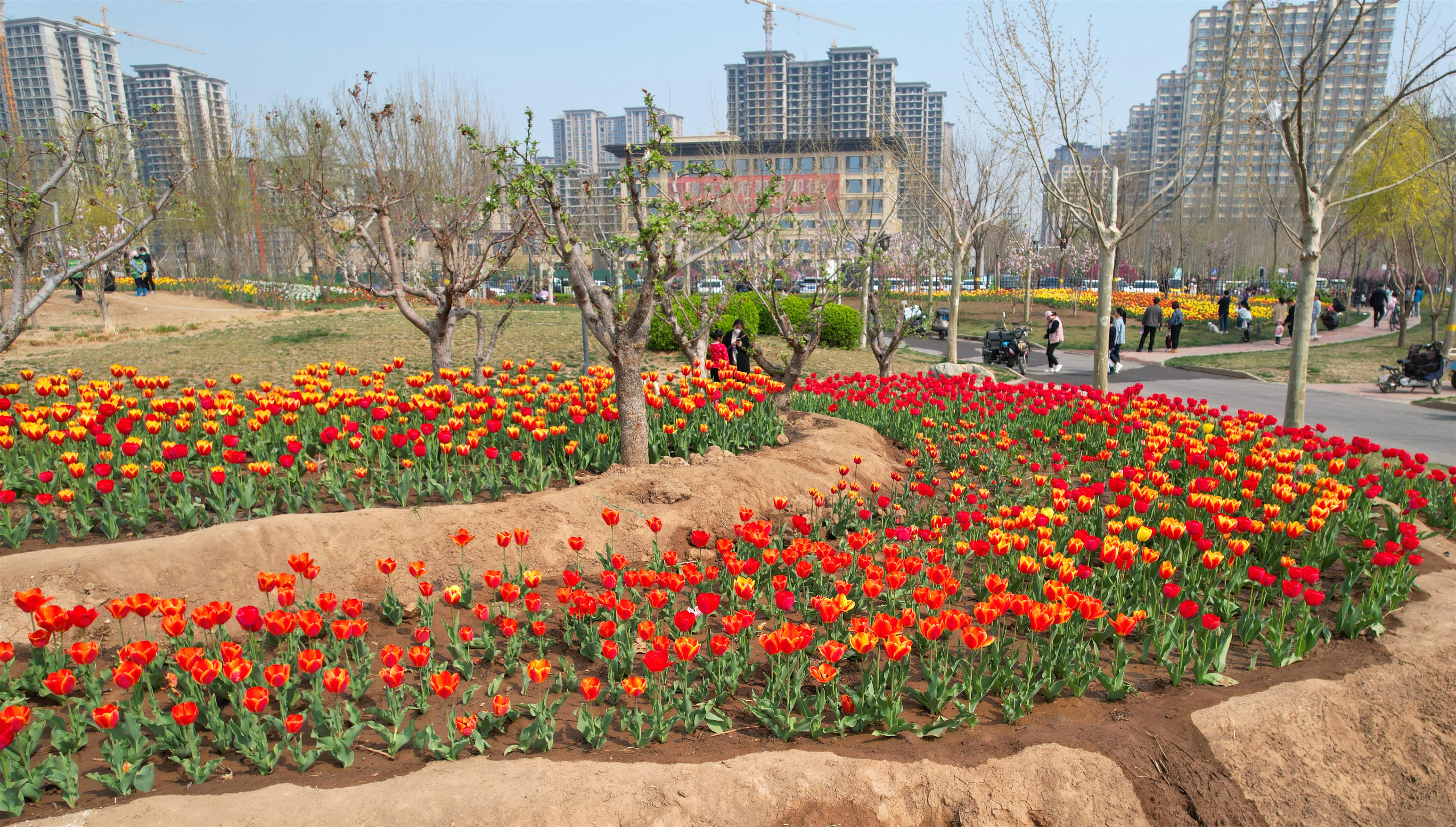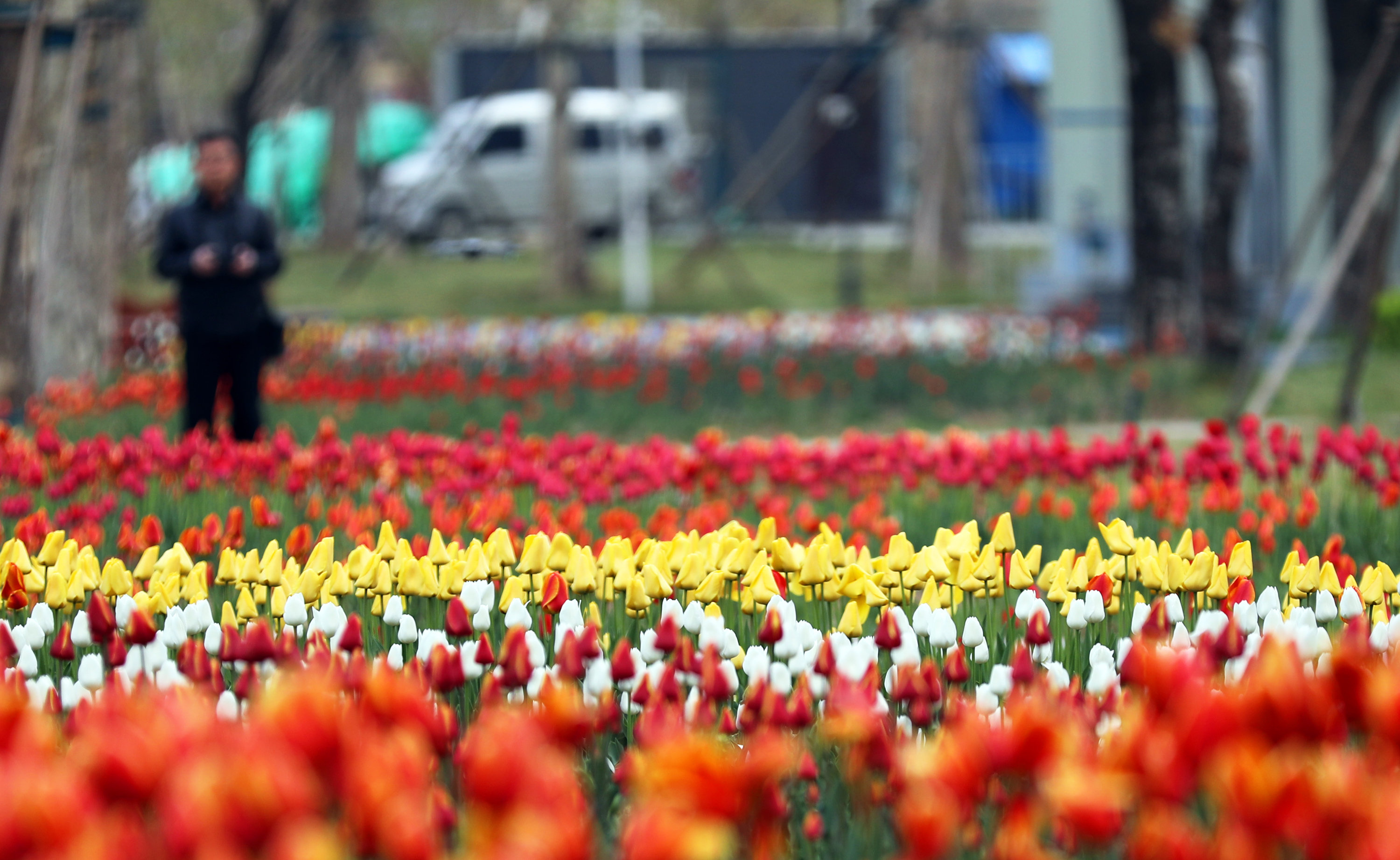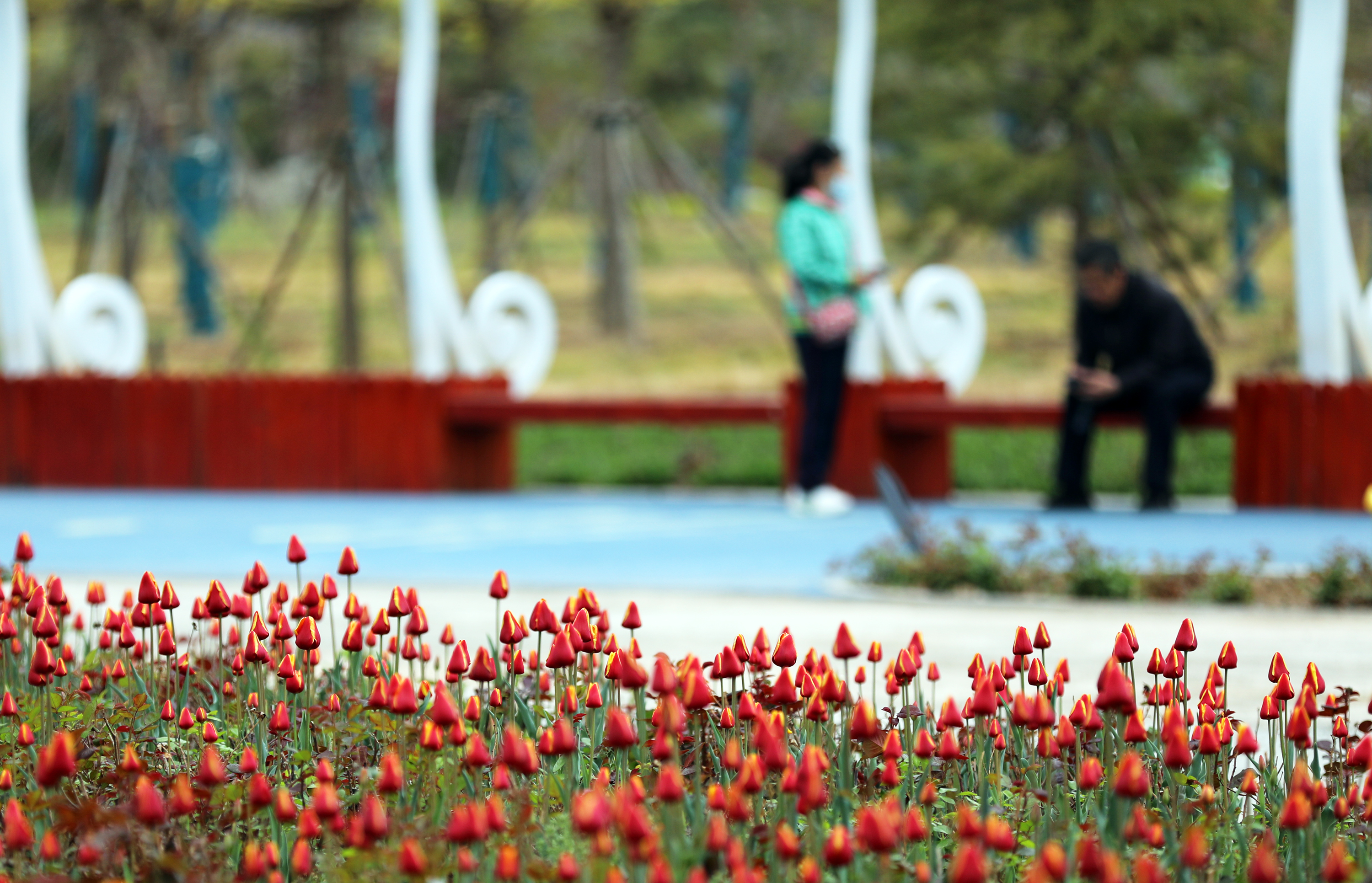 沿著公園的游步道走去,一朵朵、一叢叢的郁金香映入眼簾。在微風(fēng)的吹拂下,郁金香輕盈舞動(dòng),紅色白色黃色粉色……不同顏色的郁金香交織成一片色彩繽紛的花海。不少市民或三兩漫步、或拍照留念,盡情穿梭在花海里踏青賞春,讓春天的美好在手機(jī)中定格。