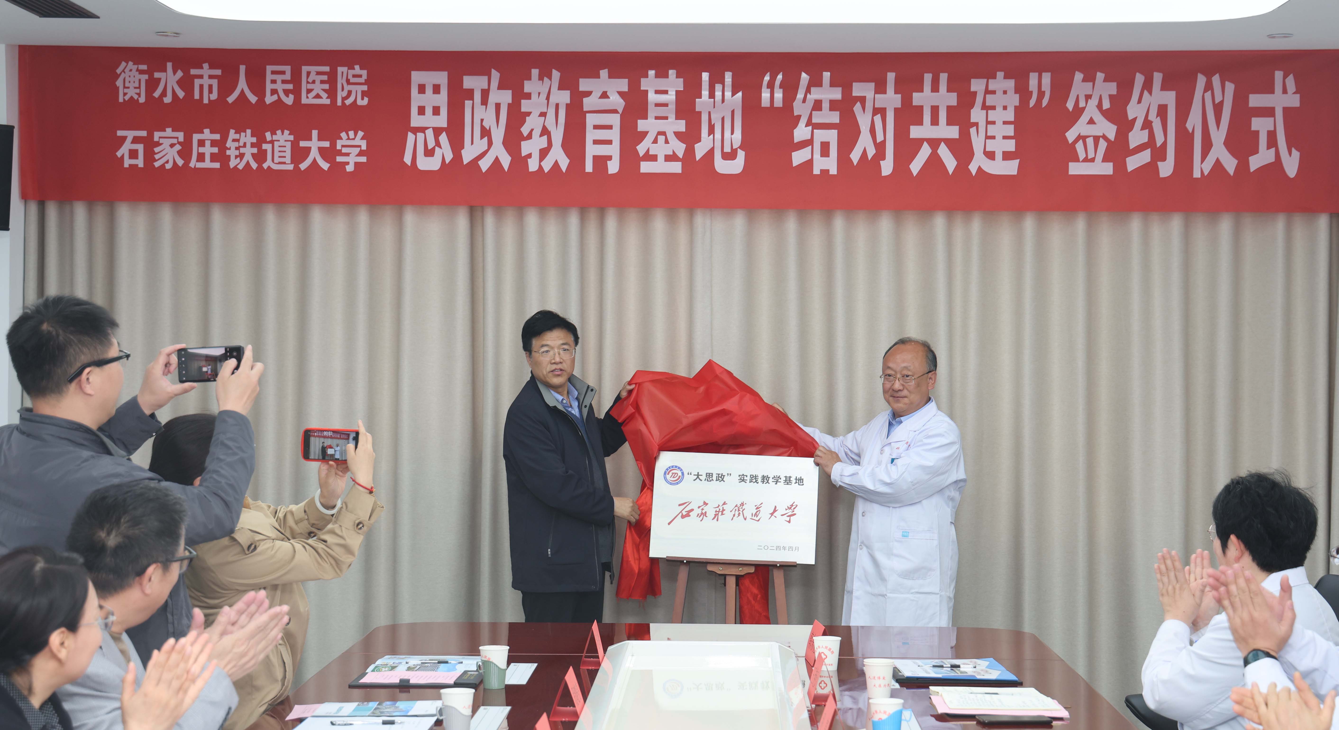 衡水市人民醫院(哈勵遜國際和平醫院)黨委書記鄭輝與石家莊鐵道大學黨委書記馮文杰共同舉行“大思政”實踐教學基地揭牌儀式。