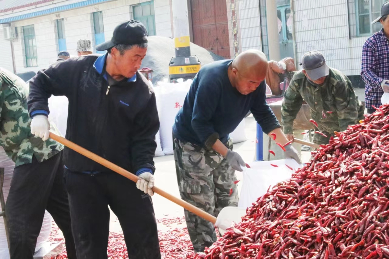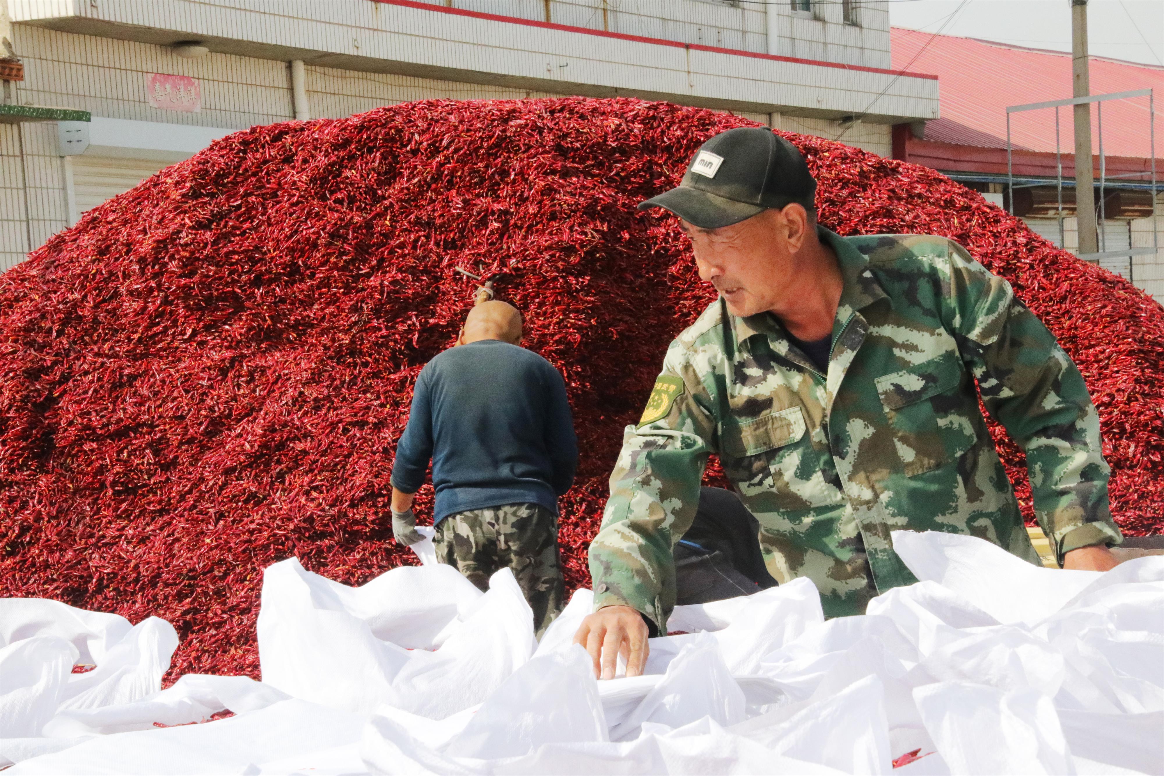 在冀州區(qū)周村鎮(zhèn)辣椒交易市場(chǎng),像李金棟這樣的辣椒供銷(xiāo)商有很多。“我干這行有30多年了,每年從我這兒賣(mài)出去的能有25000公斤左右,銷(xiāo)往全國(guó)各地。”李金棟說(shuō),“工人們都是老伙計(jì)了,來(lái)自周邊村,農(nóng)閑時(shí)過(guò)來(lái)打個(gè)零工,可以補(bǔ)貼家用。”