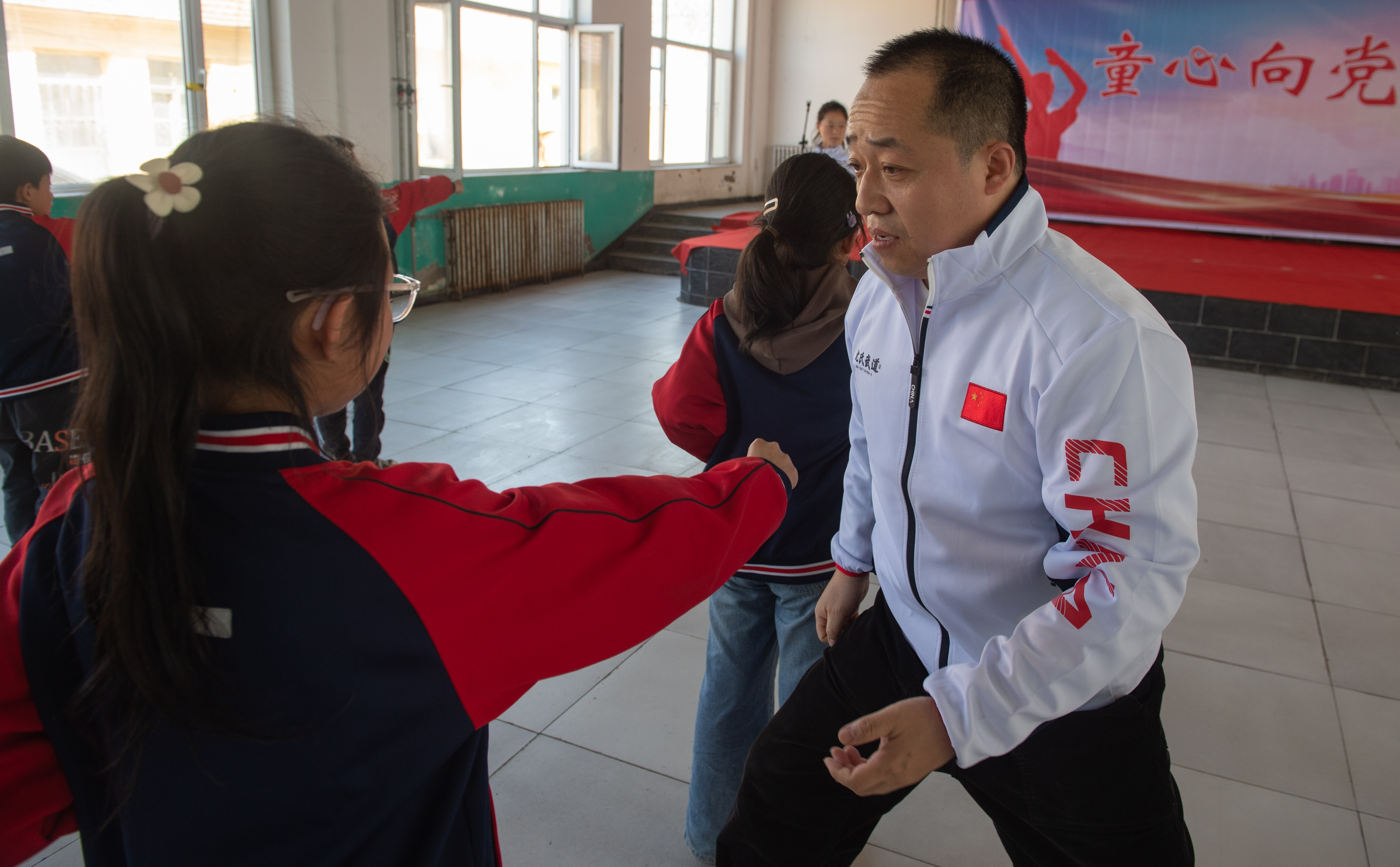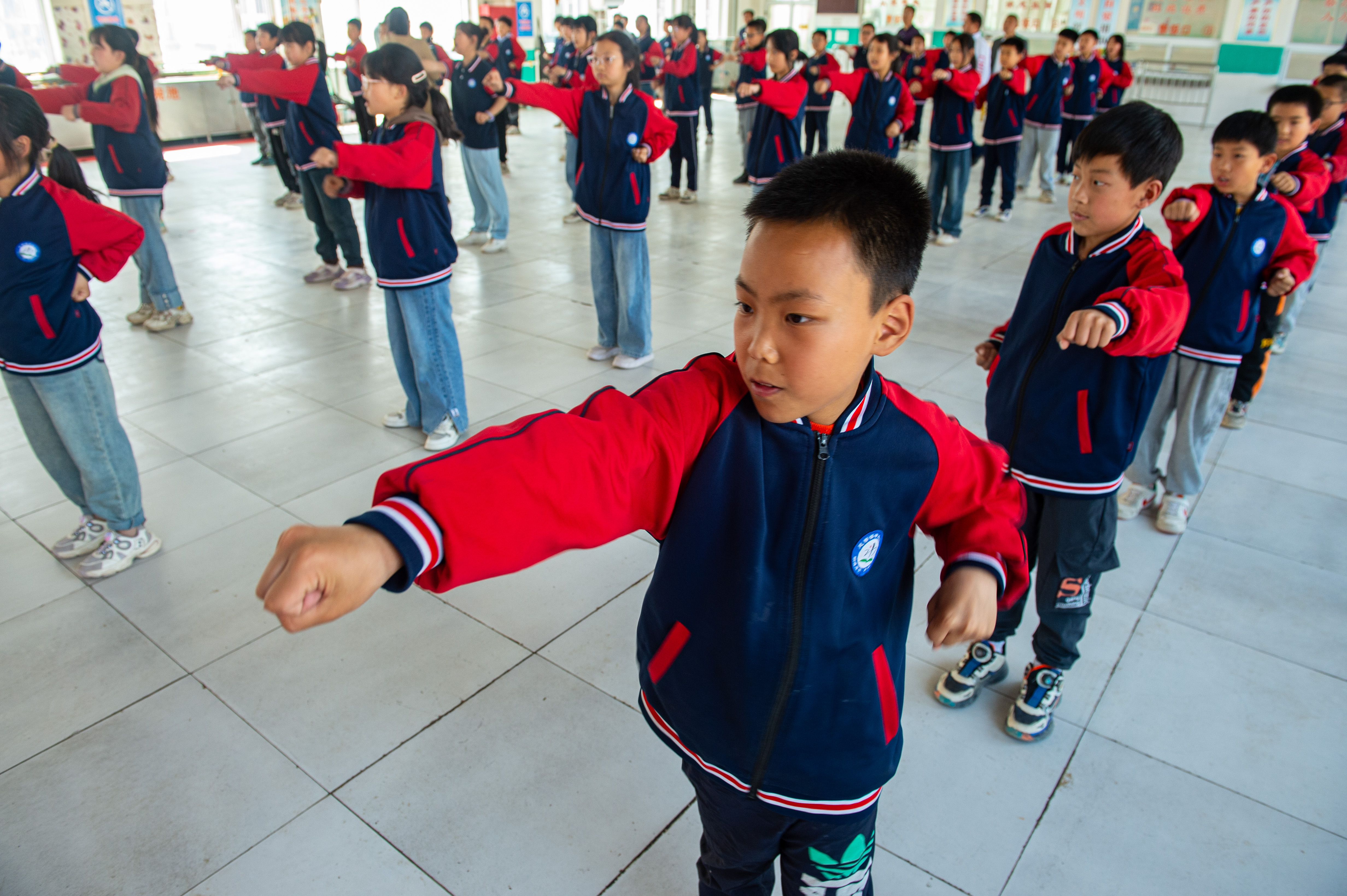 啟動(dòng)儀式后,來(lái)自衡水市沈氏武道學(xué)校的武術(shù)教練為恩察鎮(zhèn)明德小學(xué)的同學(xué)們帶來(lái)了第一堂武術(shù)課。課堂上,武術(shù)教練一邊講解動(dòng)作要領(lǐng),一邊為學(xué)生進(jìn)行動(dòng)作示范。學(xué)生們?cè)诮叹毜闹笇?dǎo)下,時(shí)而掄臂砸拳、時(shí)而歇步亮掌,一招一式充分展現(xiàn)了孩子們陽(yáng)光、向上、活潑、健康的精神風(fēng)貌。