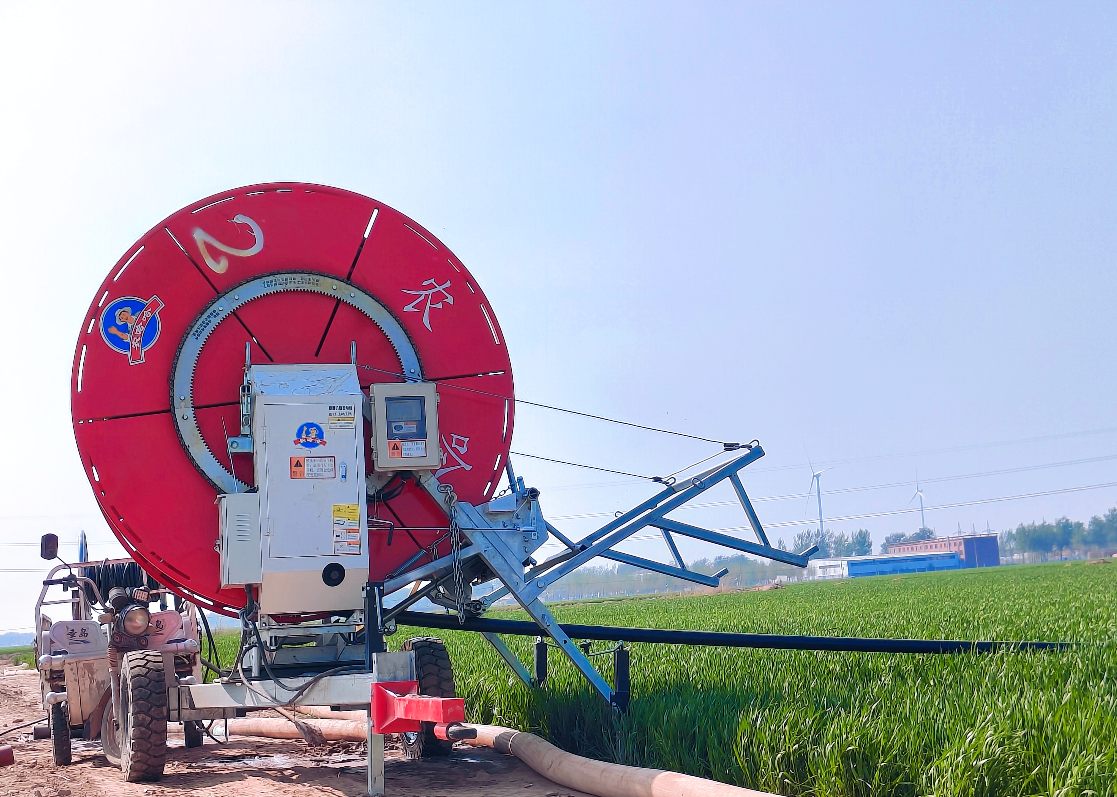 下車探尋,原來是一架紅色自走式噴灌機立于地頭,田里一架大型噴灌裝置正在以高效的作業狀態完成灌溉工作。