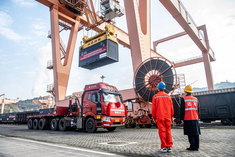 ??1月4日,在重慶萬州新田港站,工作人員進(jìn)行集裝箱吊裝作業(yè),將專列貨物轉(zhuǎn)運(yùn)至公路物流環(huán)節(jié)。新華社記者 唐奕 攝