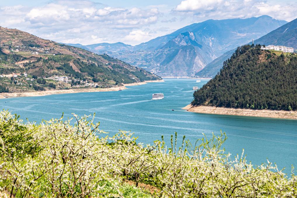 ??3月25日拍攝的重慶市巫山縣曲尺鄉(xiāng)長江兩岸的萬畝李花。新華社記者 唐奕 攝