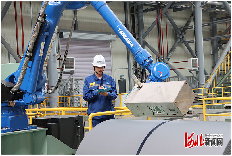 4月19日,河鋼浦項2號鍍鋅產線工程師王云磊檢查智能打標機器人運行情況。 河北日報通訊員 李彥良攝