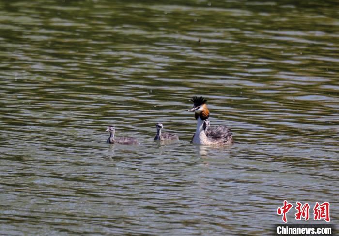 4月24日,幼鳥跟隨成鳥在湖面上游弋。陳康 攝