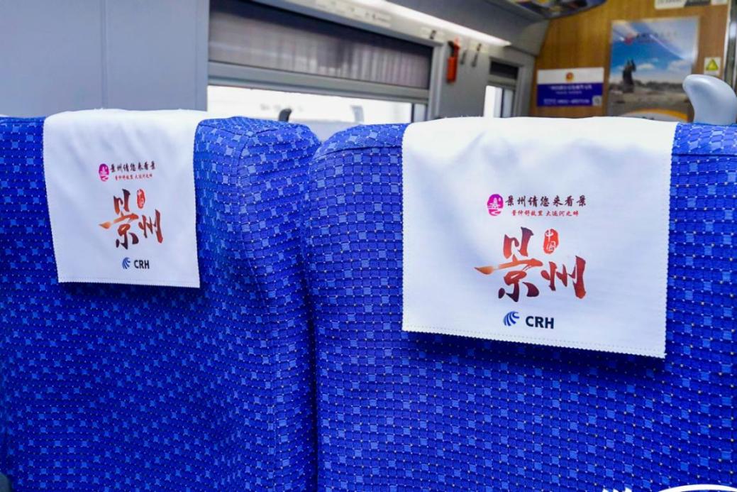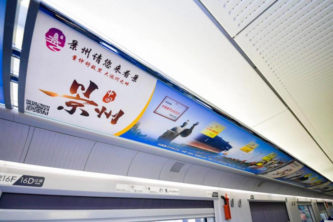 “董仲舒故里 河北景州”高鐵冠名首發(fā)的G429次列車從北京西站始發(fā),終點站為蘭州西。首發(fā)儀式現(xiàn)場,印有“董仲舒故里 河北景州”冠名標志的高鐵列車,格外引人注目。走進車廂內(nèi)部,印有“景州請您來看景”“千年運河 文脈圣地”“魅力儒鄉(xiāng) 古塔風(fēng)濤”景縣文化元素的頭片、桌貼、海報、品牌天幕等,為景縣構(gòu)建了一個沉浸式的“移動城市展廳”,立體化、持續(xù)向人們展現(xiàn)景縣的文化底蘊和自然風(fēng)光。