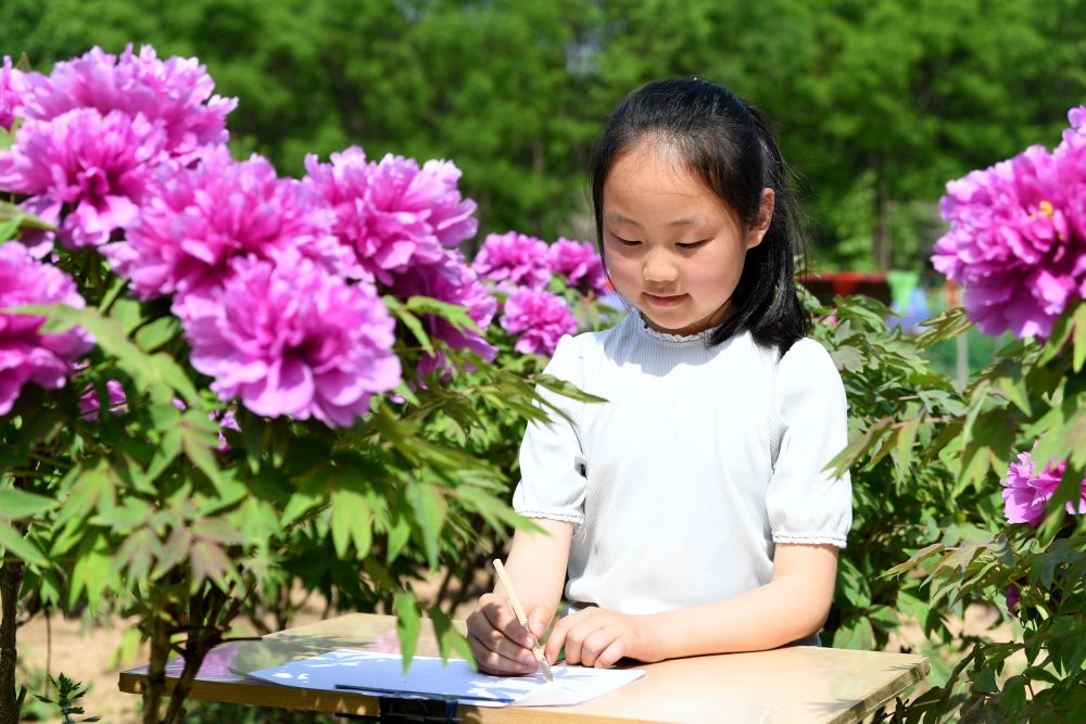 ↑4月26日,小朋友在阜城縣牡丹觀光園內寫生。