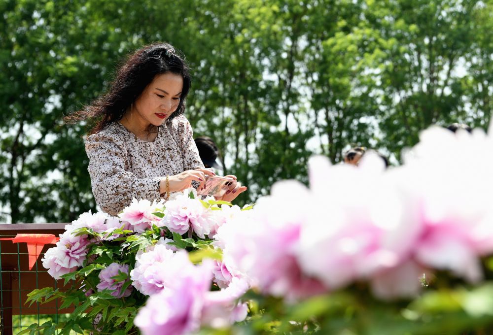 ↑4月26日,游客在阜城縣牡丹觀光園內拍照。