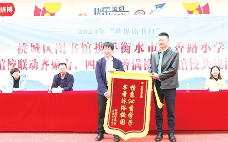 當學生們接過一摞摞嶄新的圖書,臉上露出開心的笑容。學生們嘹亮整齊的《少年中國說》誦讀聲響起,傳到校園每一個角落。中華經典的鏗鏘音韻在耳邊回響,少年意氣的勃勃生機在心頭蕩漾,感染著現場每一個人。圖書館和學校互贈了“桃城區圖書館閱讀推廣合作單位”牌匾與錦旗,共同表示今后將密切雙方合作,共同推進閱讀文化的推廣,讓更多的孩子受益,為建設書香校園、書香桃城貢獻力量。