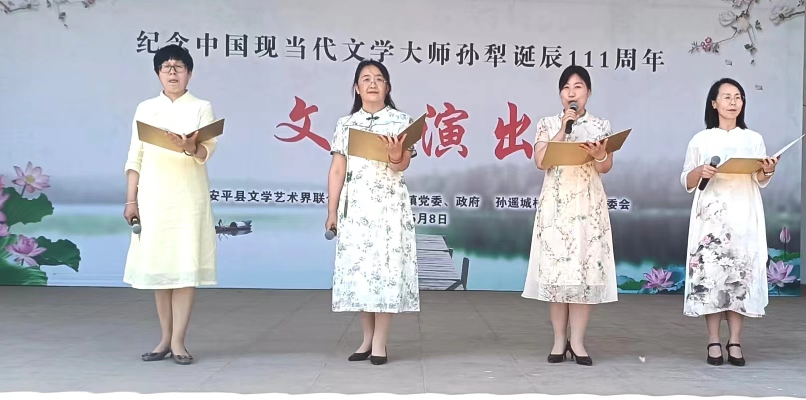 這次活動由安平縣文聯、大子文鎮黨委政府、孫遙城村“兩委”聯合主辦,整場演出歷時90分鐘,安平縣朗誦藝術學會、安平縣音樂協會、安平縣書畫家協會、安平縣作家協會、安平縣第三小學明洋舞蹈隊、超越琴行藝術培訓學校、華羽舞翩培訓學校、春之韻模特隊、美在今朝模特隊、縣城社區代表隊、大子文鎮北王宋村代表隊等近百名演職員聯袂展藝,為紀念中國現當代文學大師孫犁先生誕辰111周年,奉上了一場文化藝術盛宴。