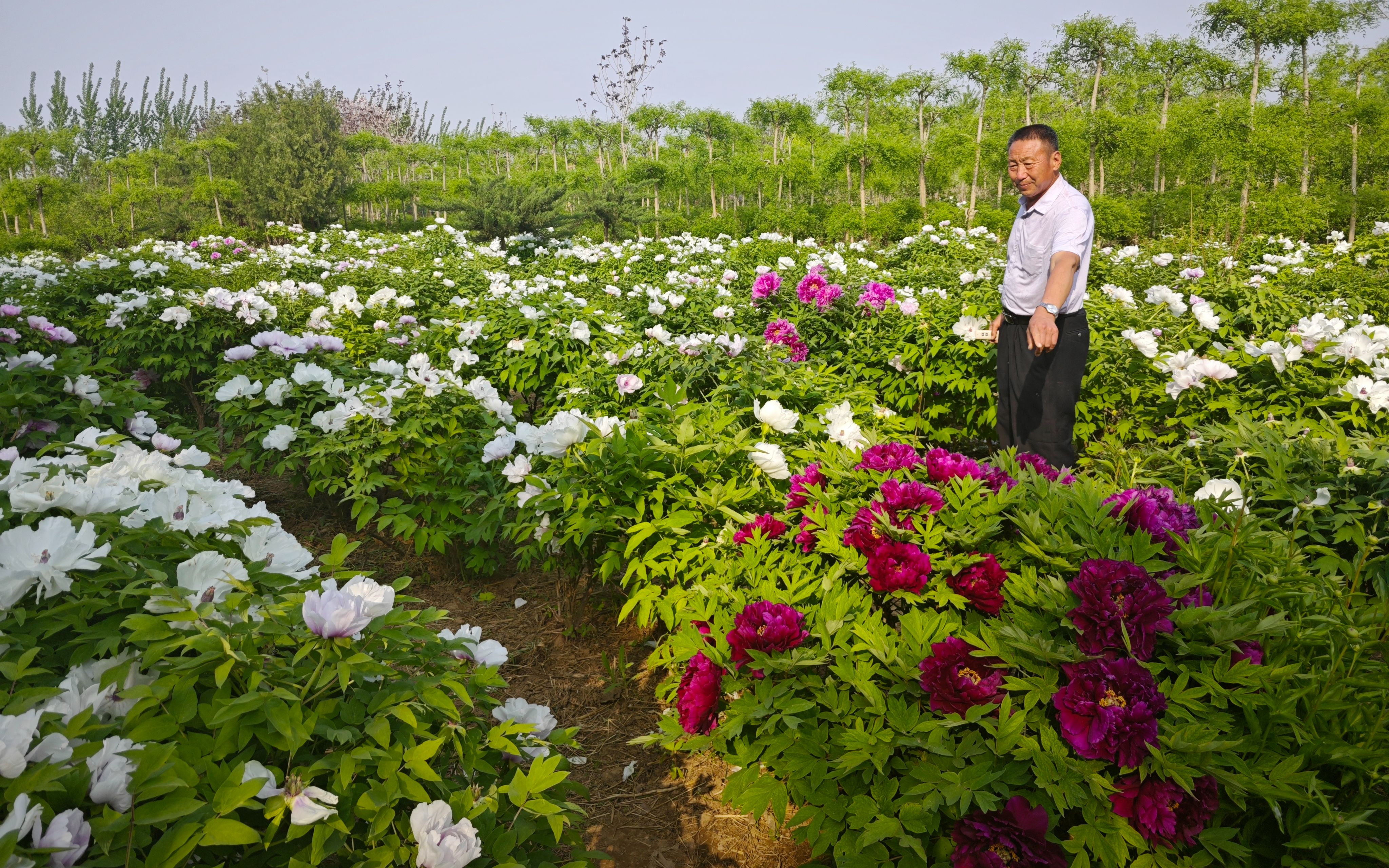 一靠近農場,花香便如海浪般撲面而來。牡丹、月季、芍藥……各色花卉陽光下競相綻放爭奇斗艷,熱烈如火的紅、溫柔似霞的粉、純潔勝雪的白,花瓣層疊,微風拂過,香氣四溢,搖曳生姿。