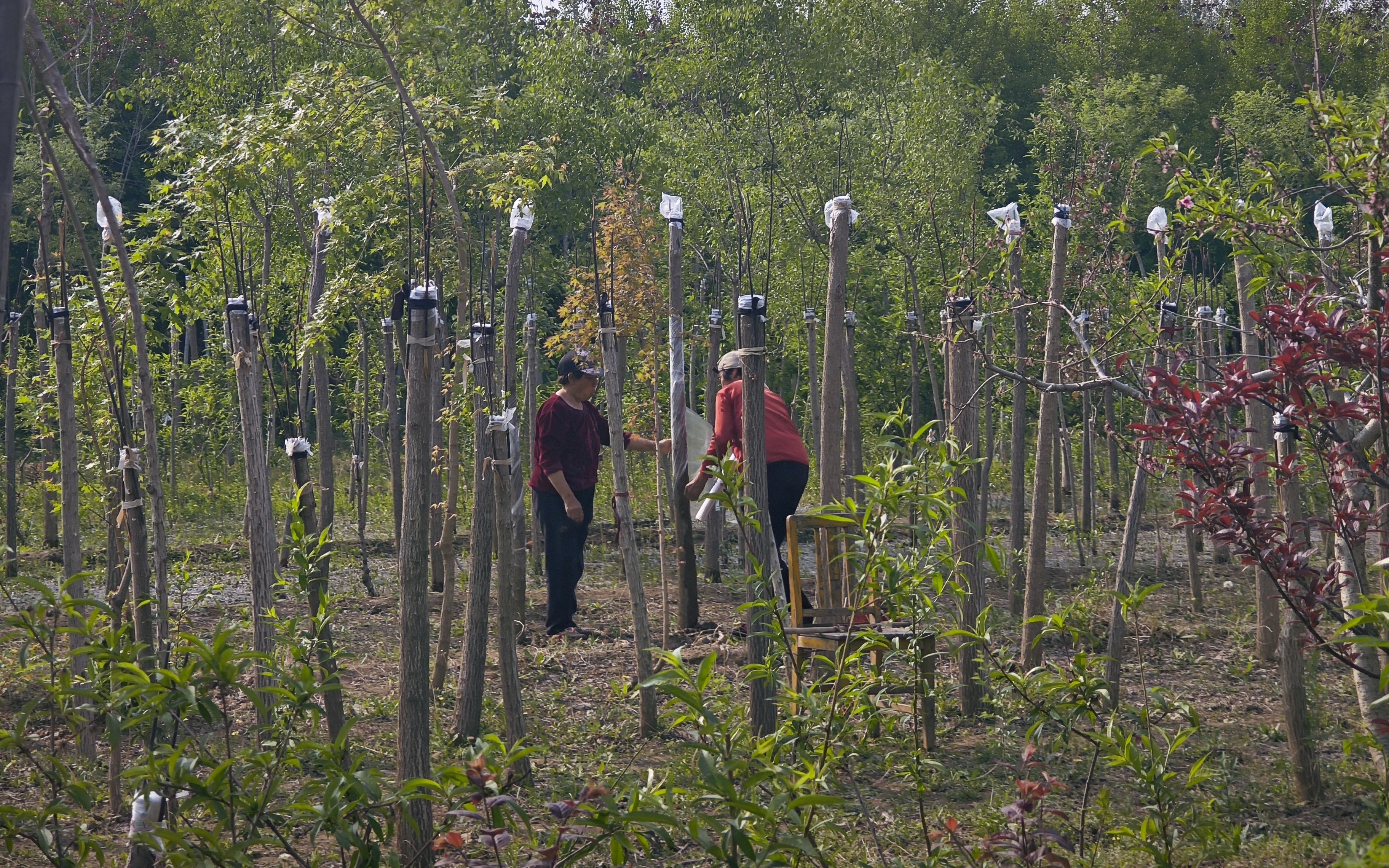 喝完茶后,郎樹全帶領記者沿著蜿蜒的小徑走進農場的深處。沿途,兩側郁郁蔥蔥的果樹映入眼簾。行走至果樹種植區,兩位農婦正在果樹間忙碌,手法嫻熟地進行著蘋果樹的嫁接工作。郎樹全介紹道:“她們都是附近的農戶,經驗豐富,手腳麻利。農場需要大量的勞動力進行種植、養護和采摘,也為周邊農戶提供了就業機會。”