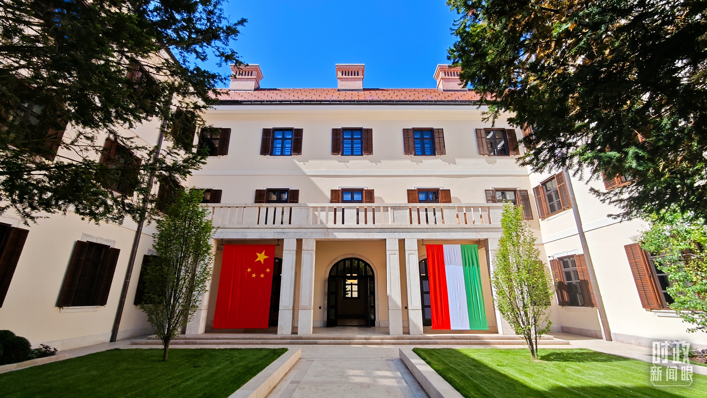 △匈牙利總統府前懸掛的中匈兩國國旗。(總臺央視記者劉琦拍攝)
