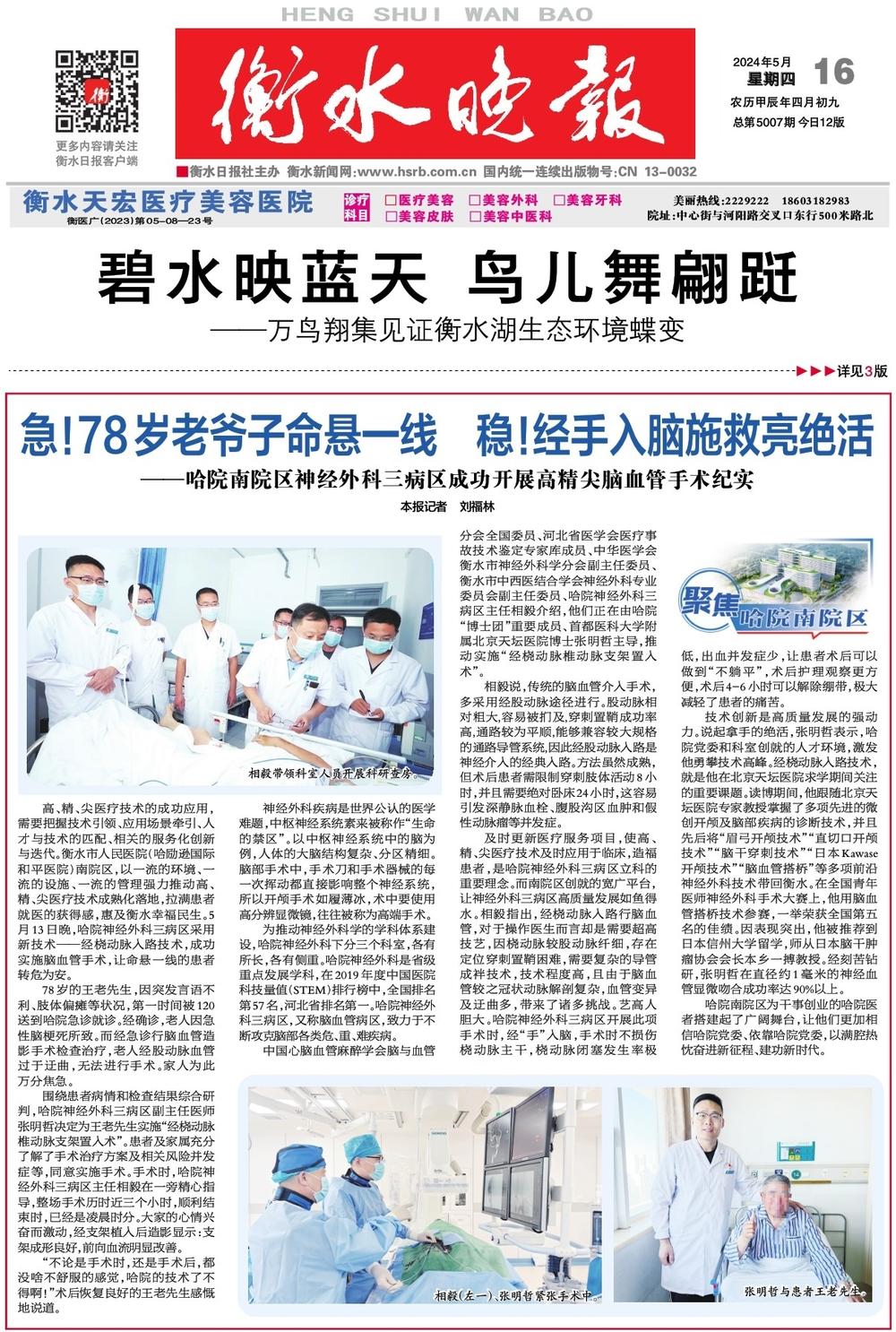 高、精、尖醫療技術的成功應用,需要把握技術引領、應用場景牽引、人才與技術的匹配、相關的服務化創新與迭代。衡水市人民醫院(哈勵遜國際和平醫院)南院區,以一流的環境、一流的設施、一流的管理強力推動高、精、尖醫療技術成熟化落地,拉滿患者就醫的獲得感,惠及衡水幸福民生。5月13日晚,哈院神經外科三病區采用新技術——經橈動脈入路技術,成功實施腦血管手術,讓命懸一線的患者轉危為安。