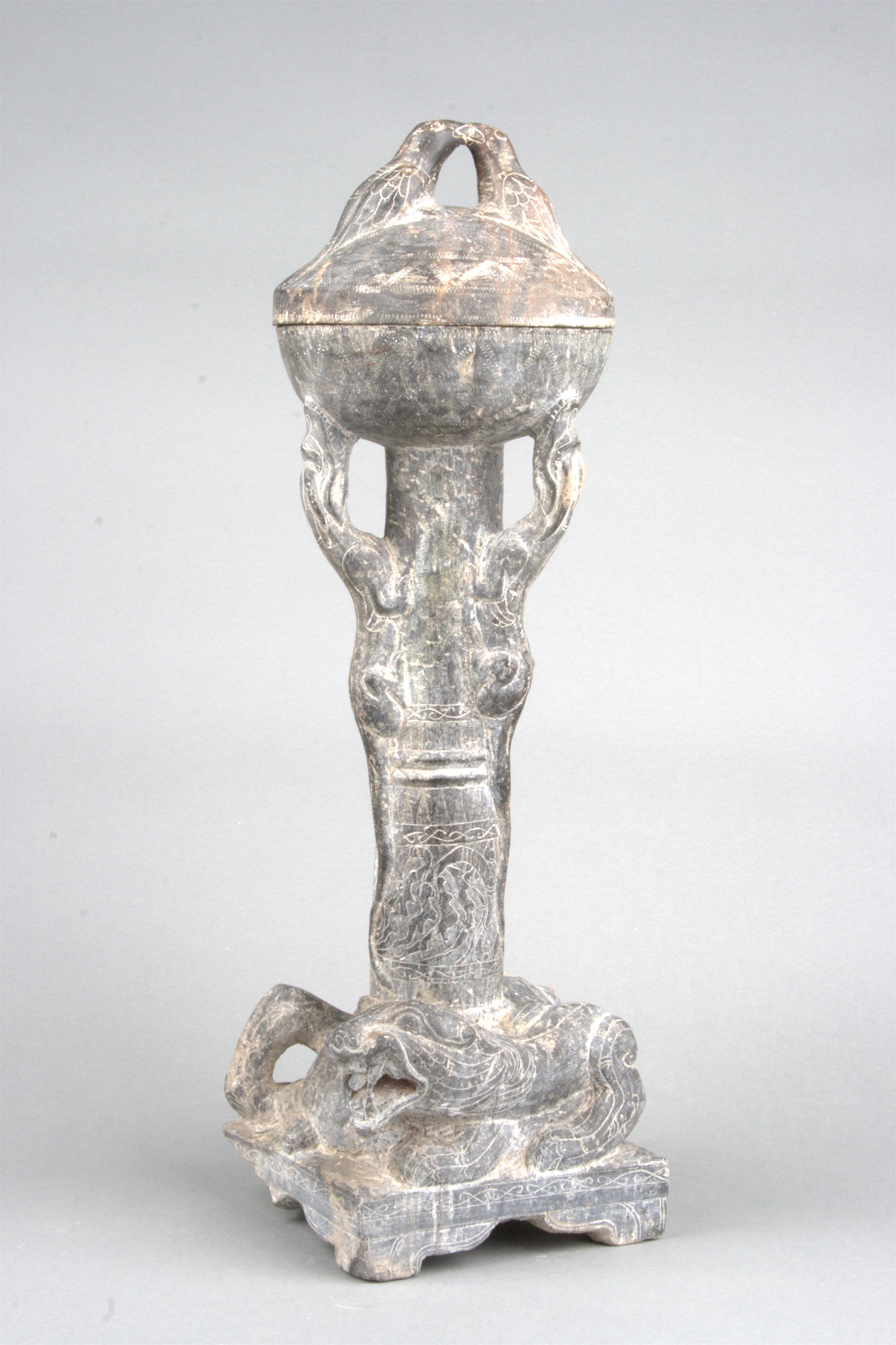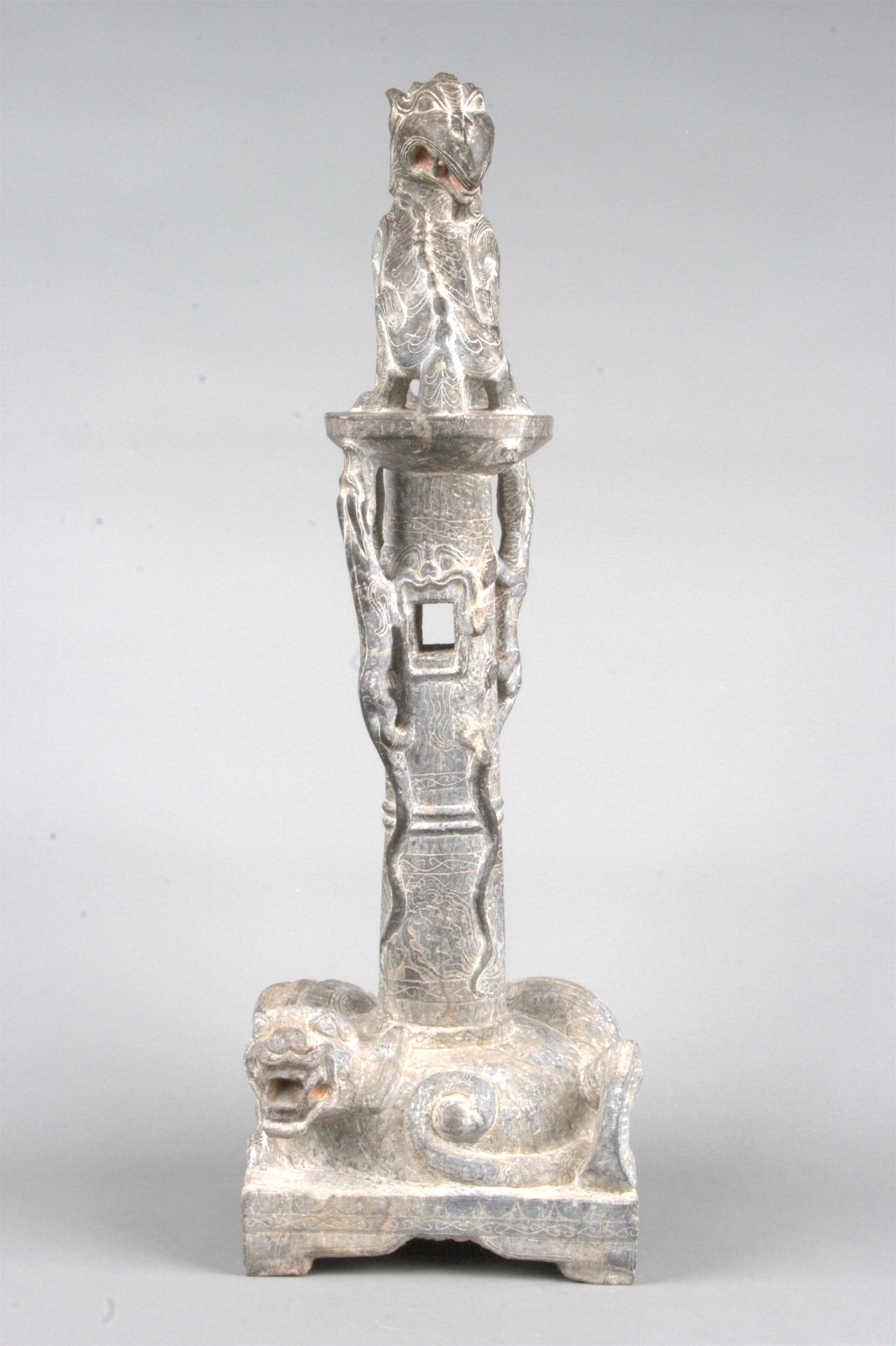 記者看到,黑石熨斗架底部為正方形,矩形足,底上浮雕一虎形獸,背部承托一圓柱狀架體,架體圓柱上浮雕四只昂首垂尾的虎形獸。四獸用吻部承托柱頂的圓形盤,盤上浮雕一只蹲坐的回頭犼。圓柱中上部雕有一虎頭。圓柱通體飾以波浪紋、鋸齒紋、凸弦紋,通高63厘米,底座邊長20.5厘米。