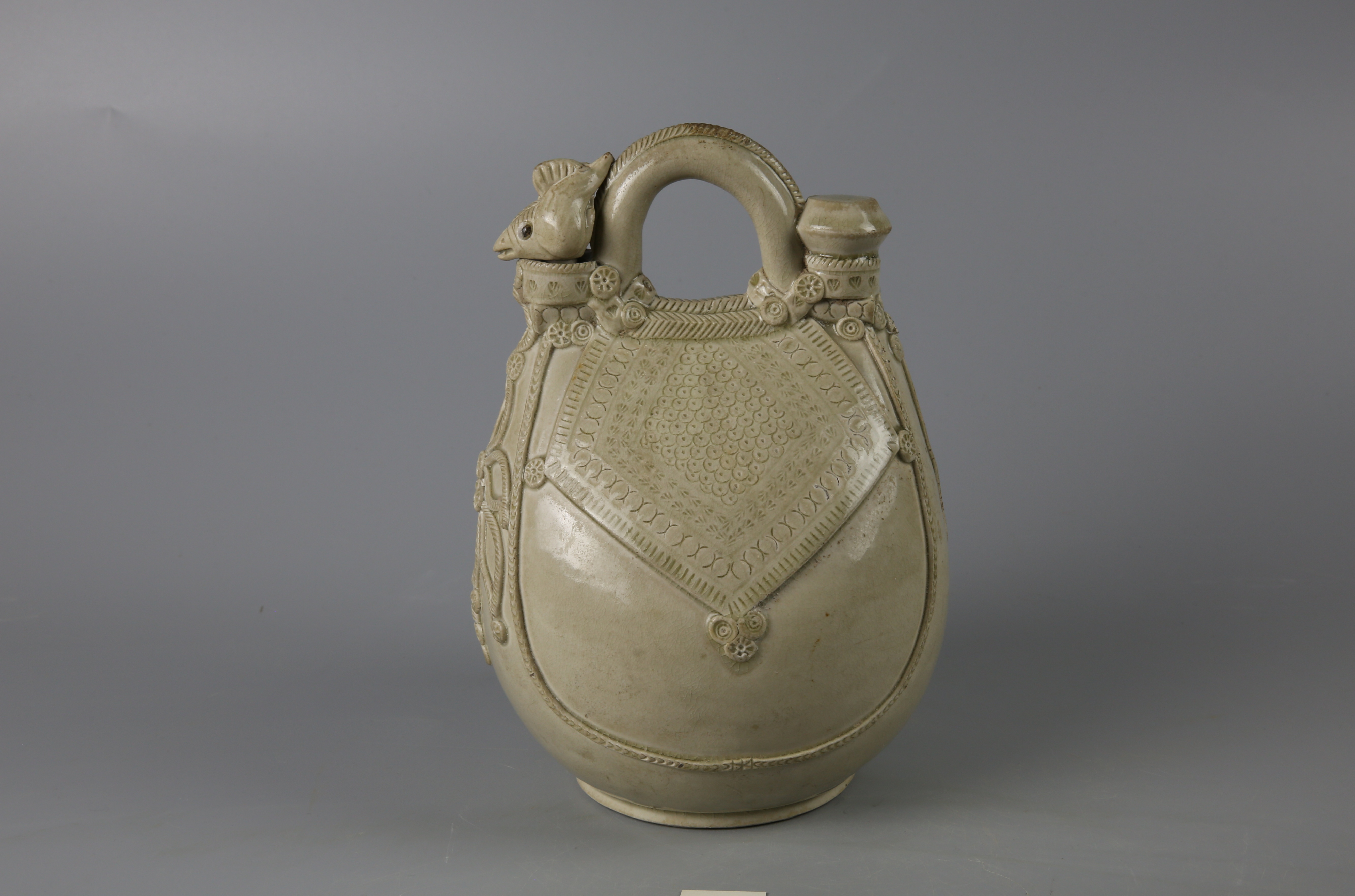 唐代邢窯白釉剔花鳳首皮囊式瓷壺