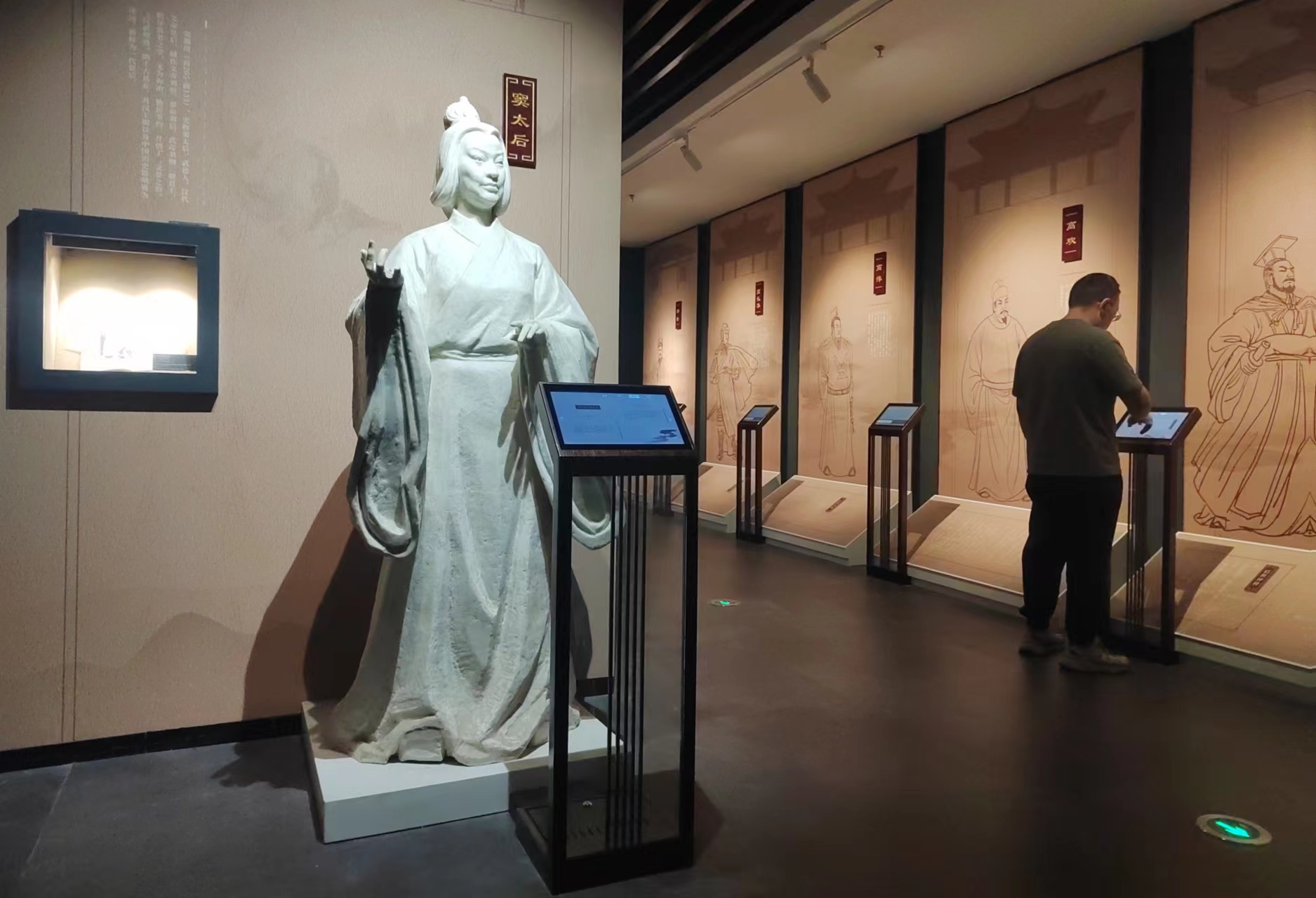 “你看,這里展示的是安平逯家莊東漢墓壁畫。這座漢墓發掘于1971年,壁畫內容為車馬出行、莊園圖等題材。”張涵介紹,為了凸顯博物館的展示教育功能,他們采用了數字化的展陳手段,通過壁畫模型結合滑軌式觸摸屏的方式,展示了東漢官職、出行配置等級、車馬具等信息。