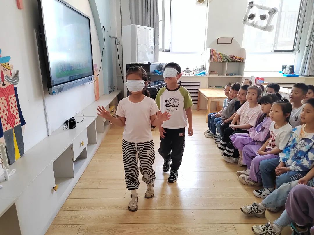在互動環節,各班老師引領孩子們戴上眼罩玩玩具、拿東西、做游戲,讓孩子們切身體驗眼睛、肢體等身體不適的殘疾人生活。