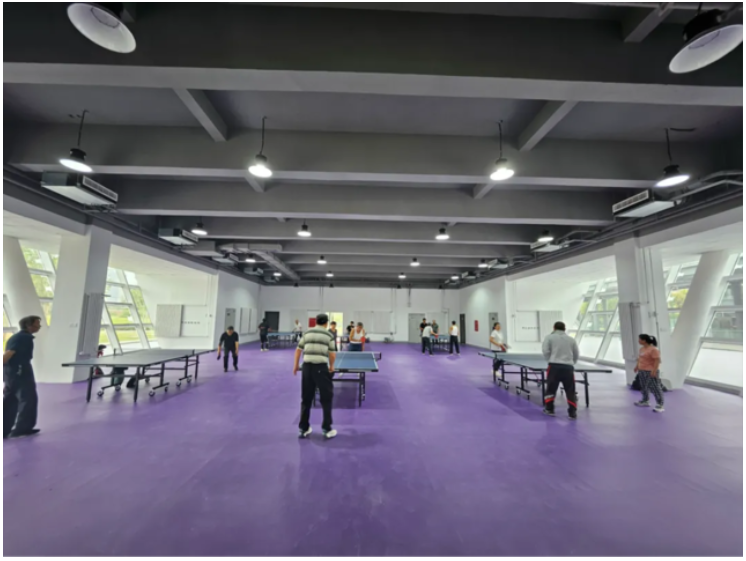 核心區(qū)域的專業(yè)乒乓球比賽場地,嚴(yán)格遵循國際標(biāo)準(zhǔn)建造,鋪設(shè)了高性能的運(yùn)動(dòng)地板,搭配專業(yè)級(jí)別的燈光系統(tǒng),為選手營造出最佳的比賽環(huán)境。