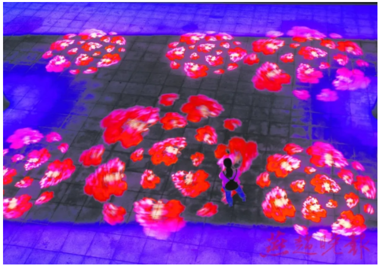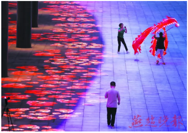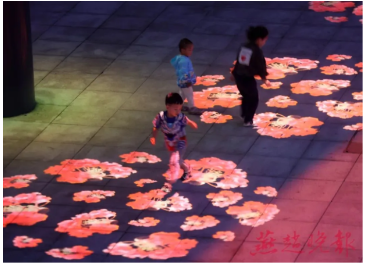 1070米長的如意彩虹空中走廊燈光亮起,純凈的藍(lán)、柔美的粉、鮮嫩的綠……柔和而唯美。在這條如意彩虹空中走廊的下方,一排排射燈打在地面上,映射出風(fēng)景各異的圖案,一會(huì)兒是五顏六色的“鮮花”,一會(huì)兒是“跳躍的金魚”,一會(huì)兒是“輕盈的水母”,一會(huì)兒又是赤橙黃綠青藍(lán)紫的彩虹帶……